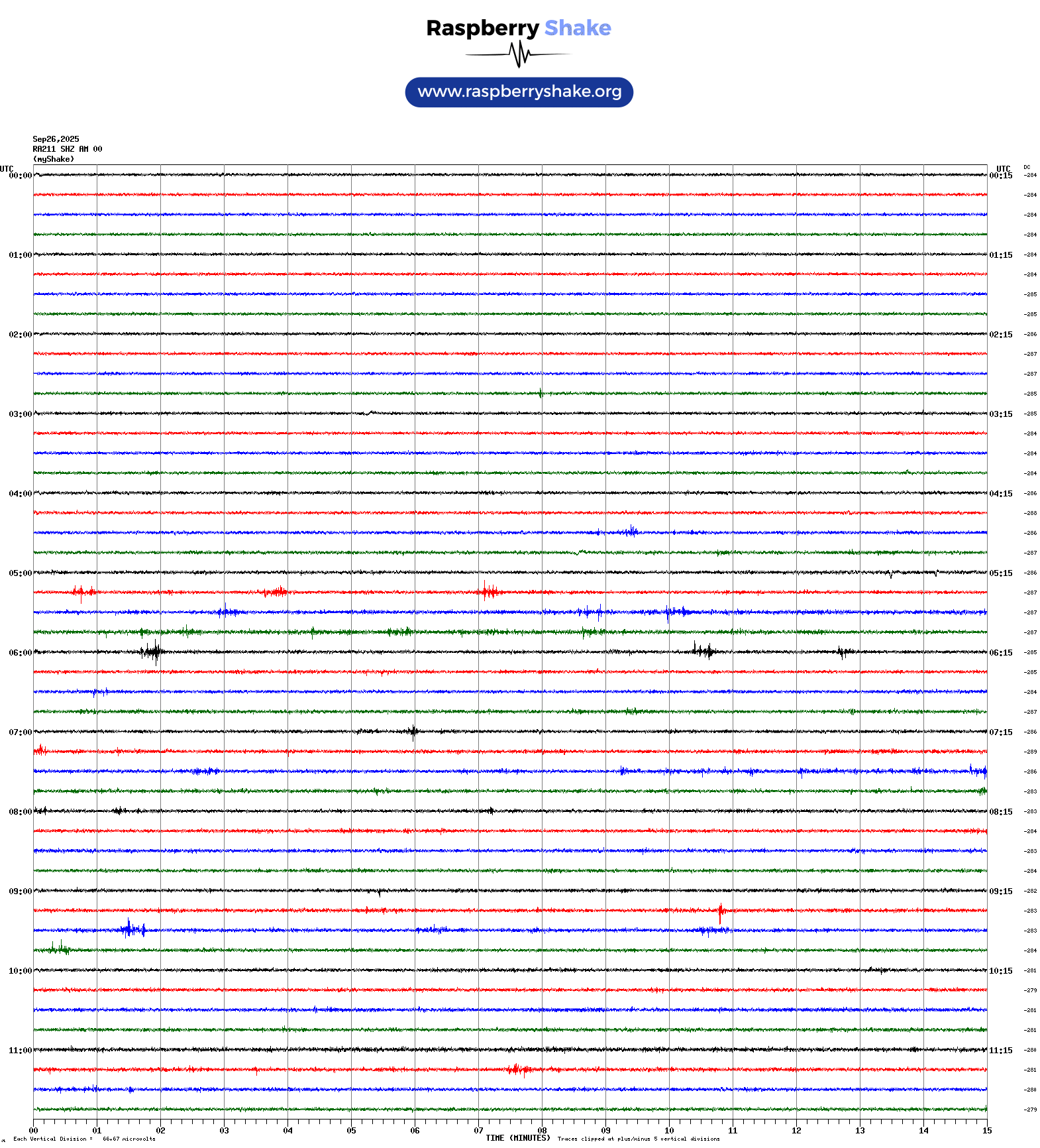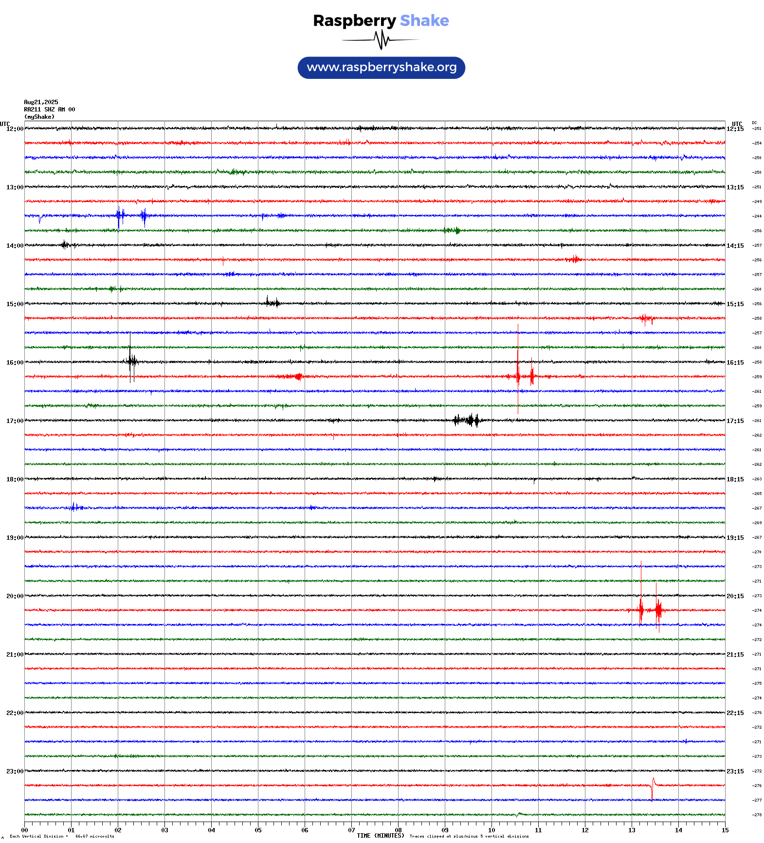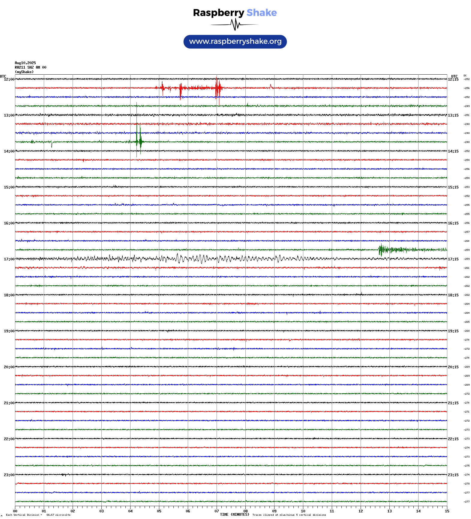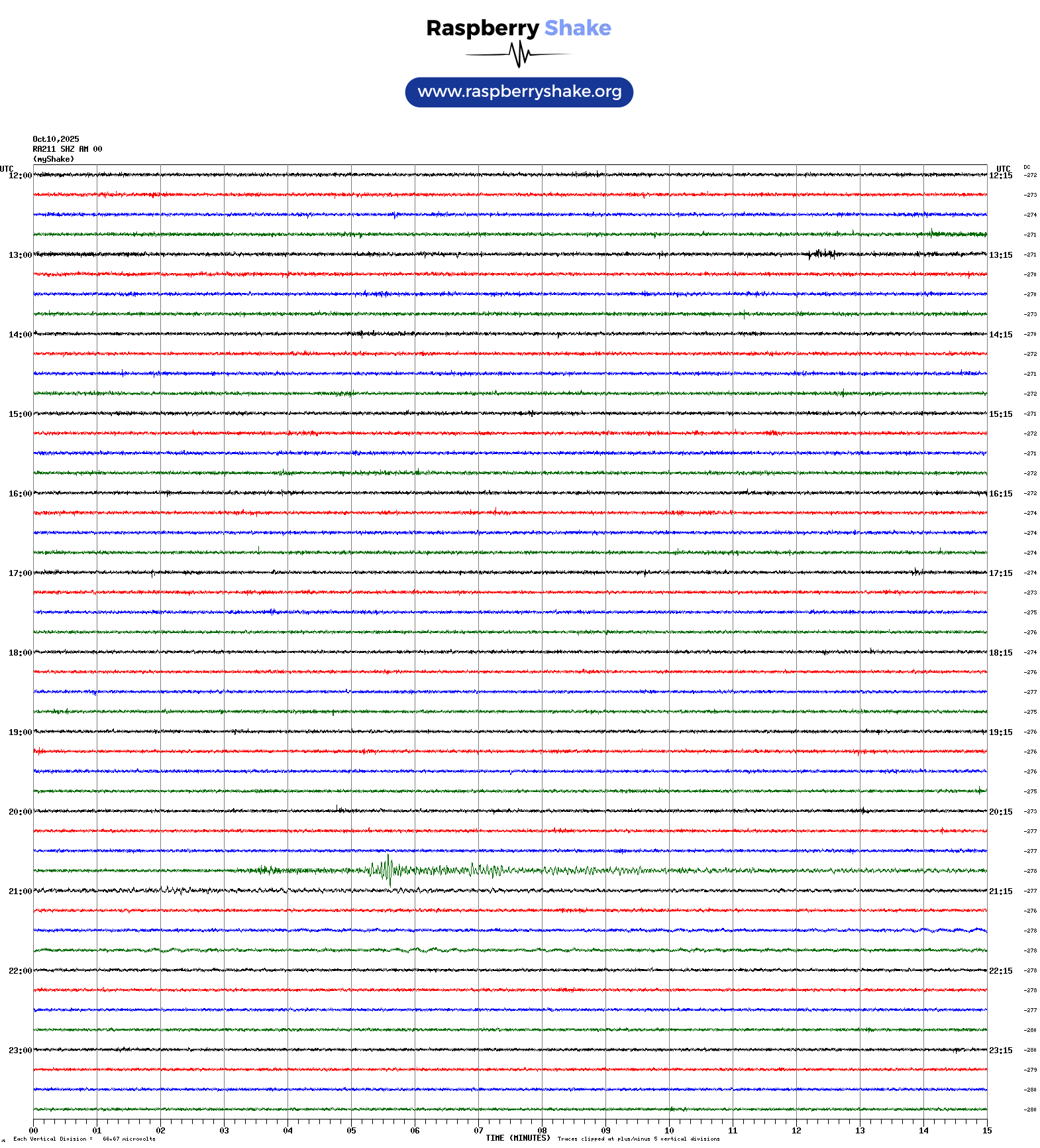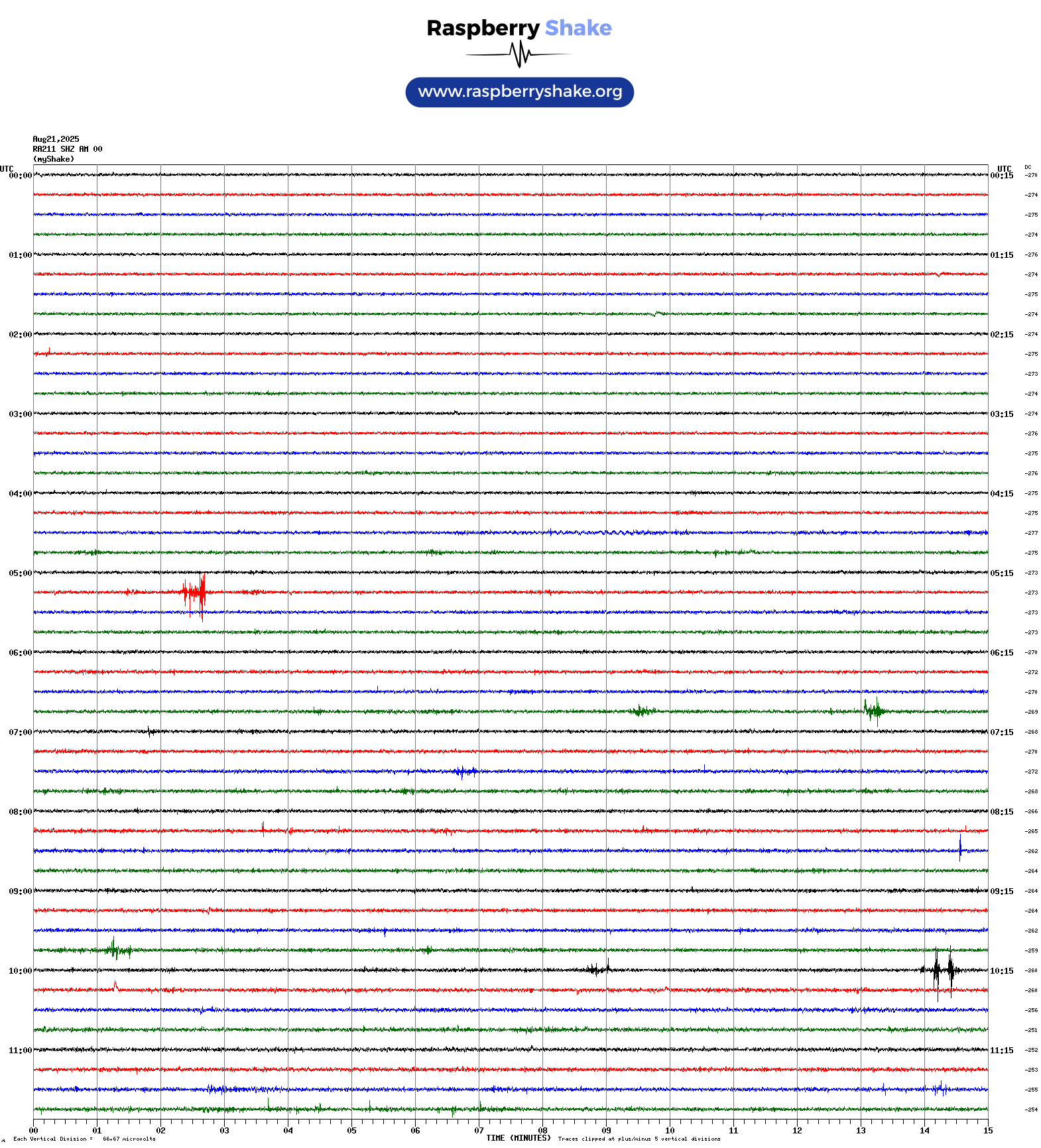 Rechts wird das Seismogramm meines Seismographen Raspberry Shake (RA211) in Naila angezeigt.