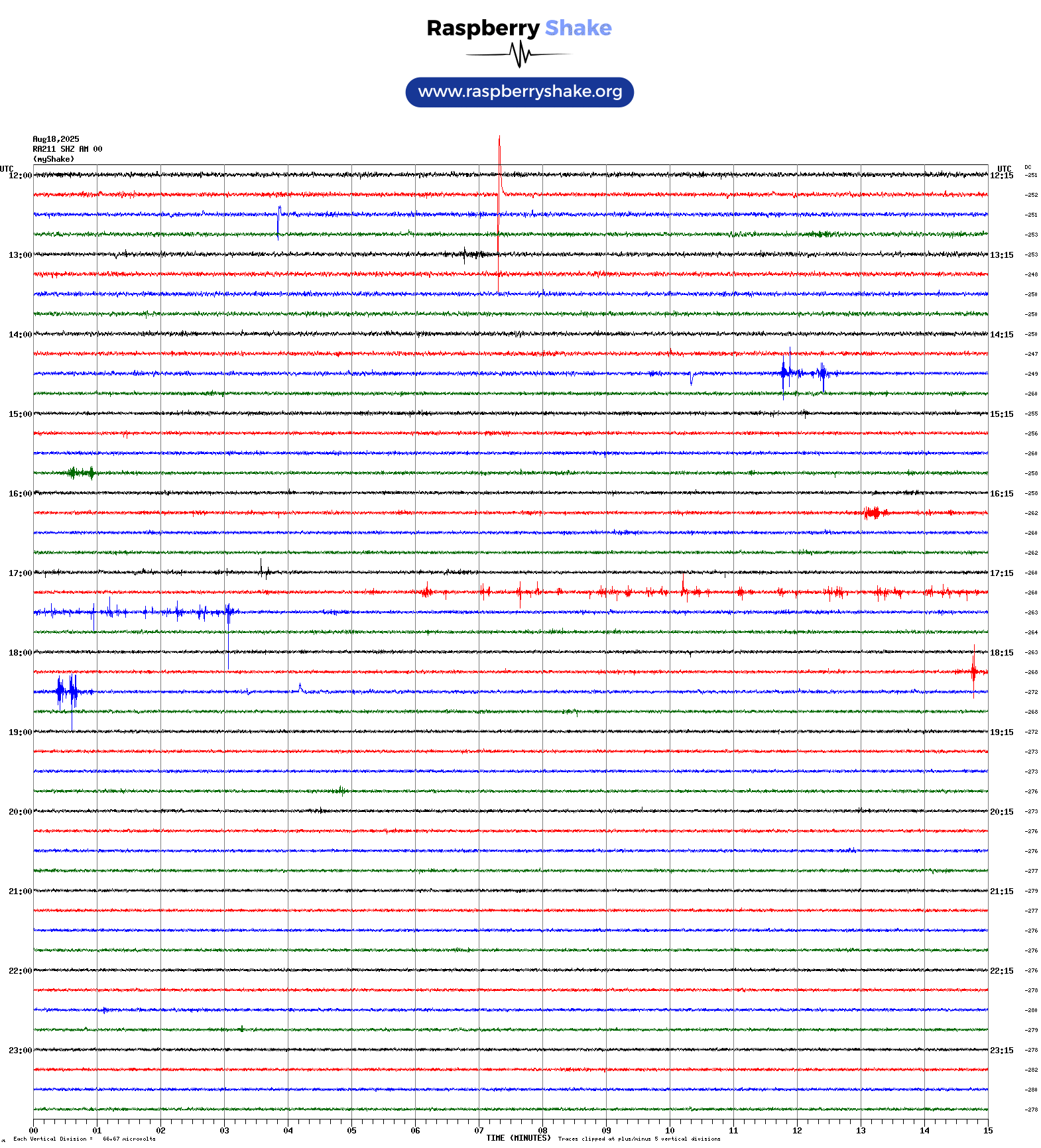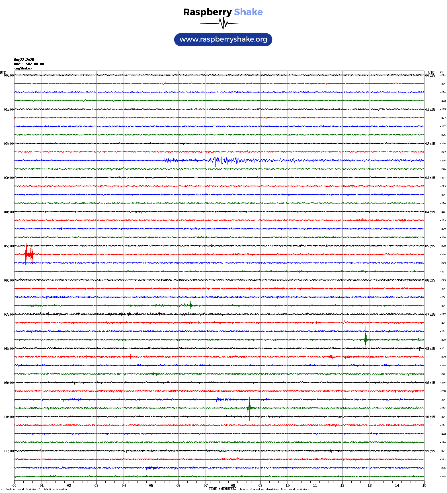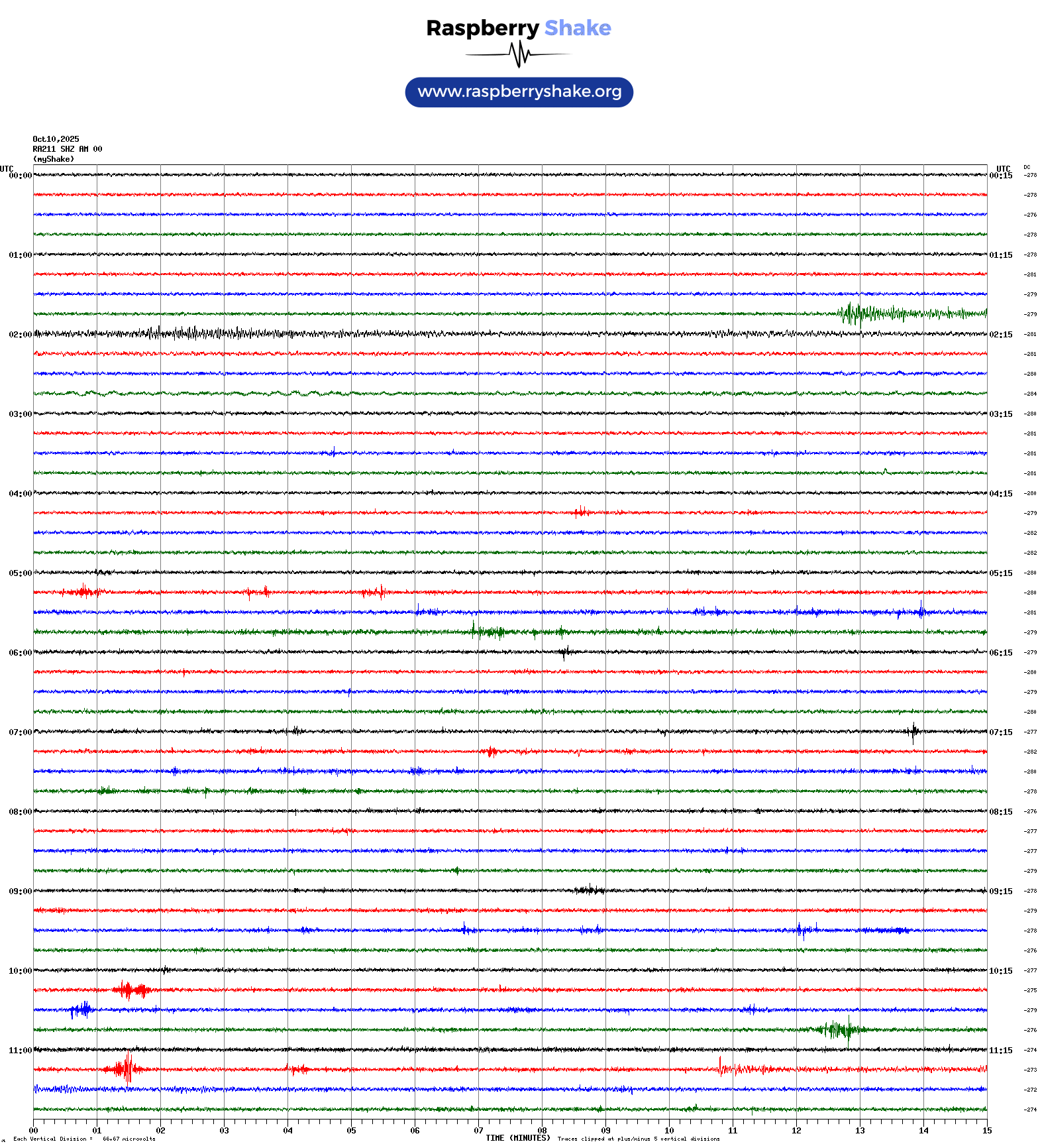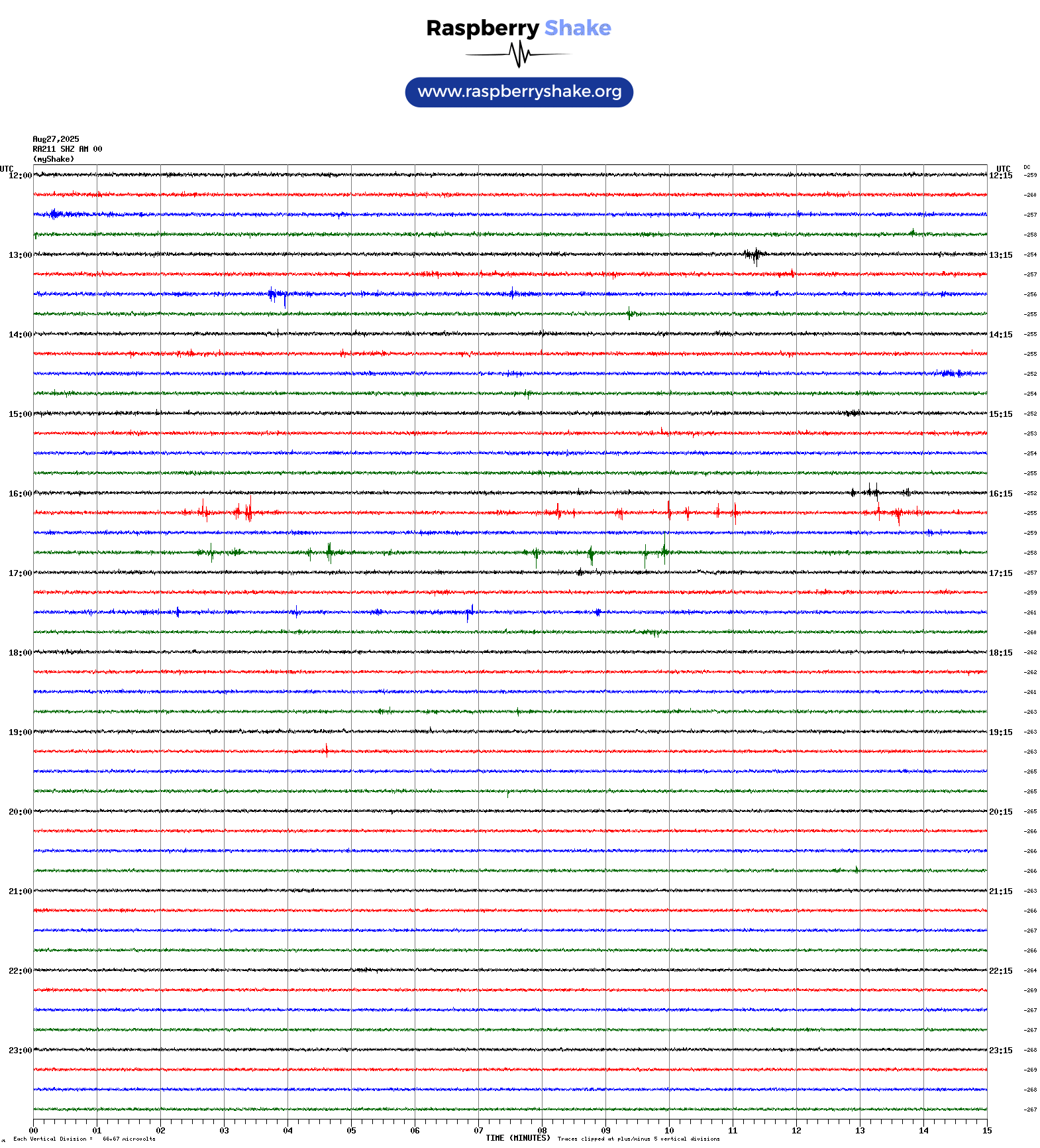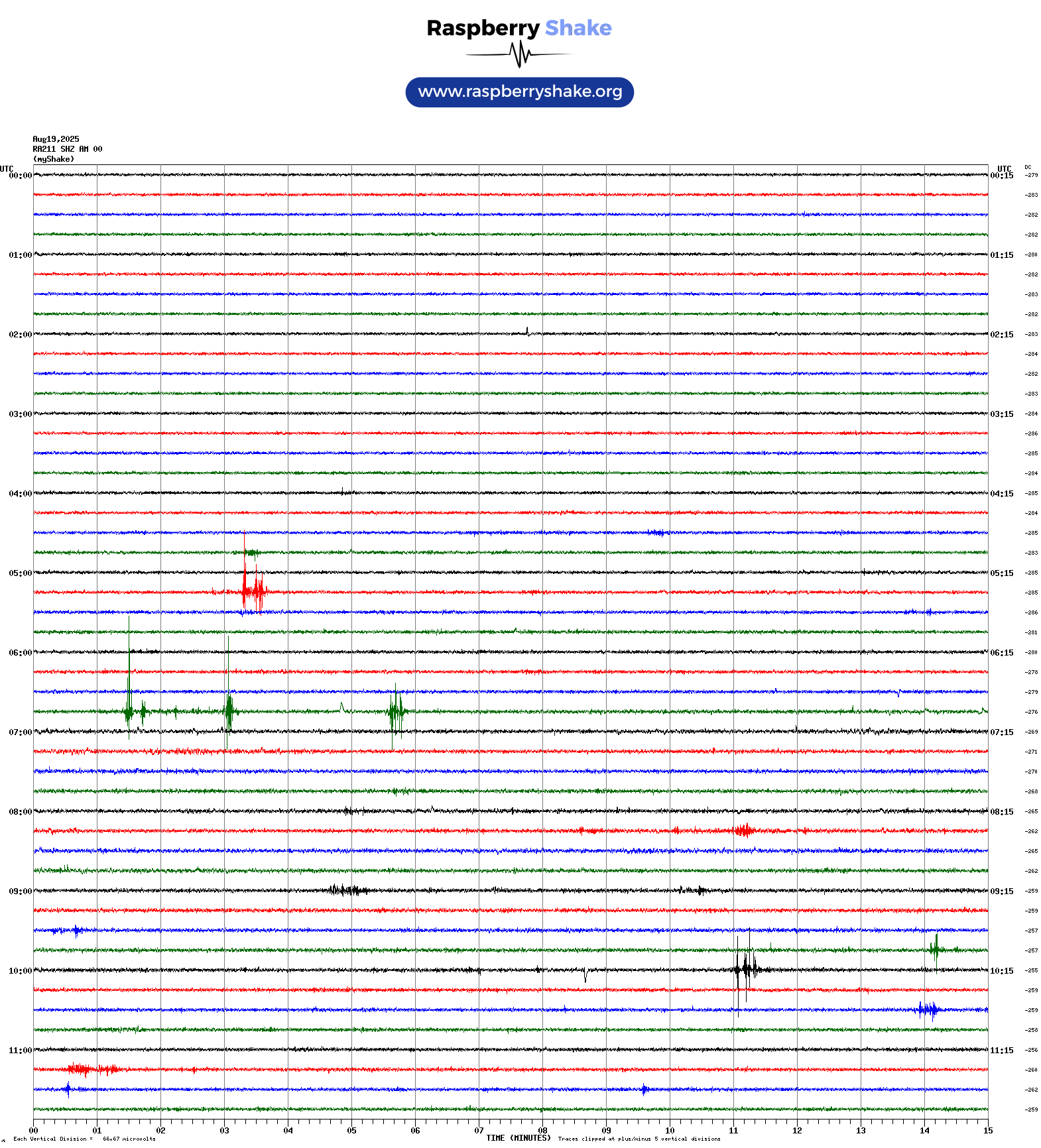 Rechts wird das Seismogramm meines Seismographen Raspberry Shake (RA211) in Naila angezeigt.