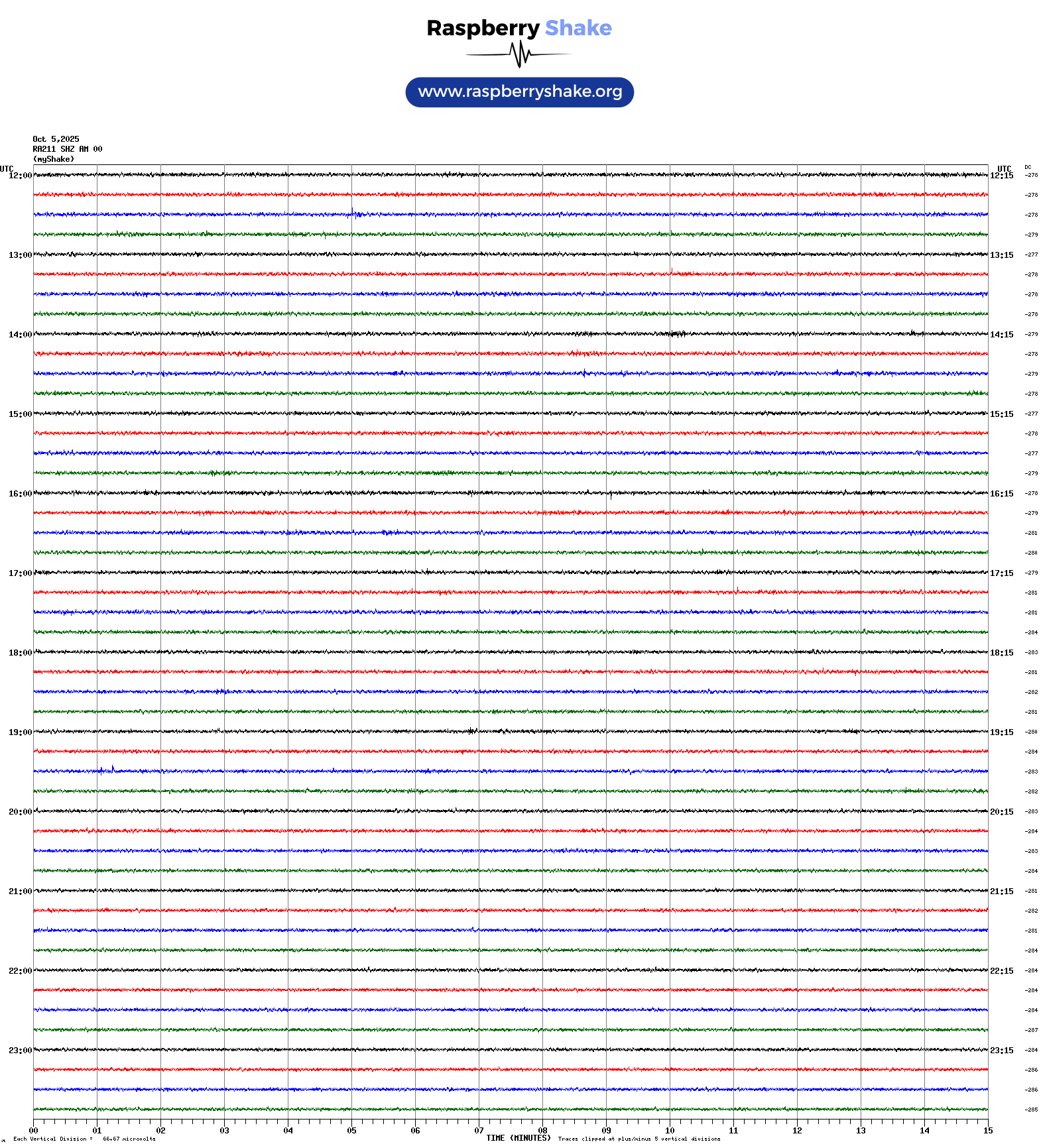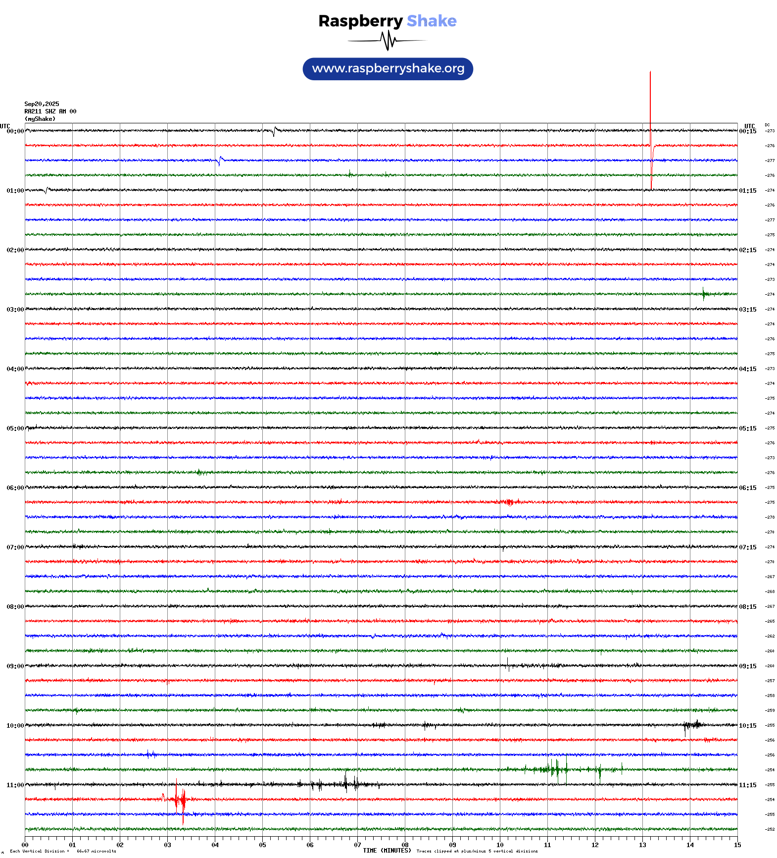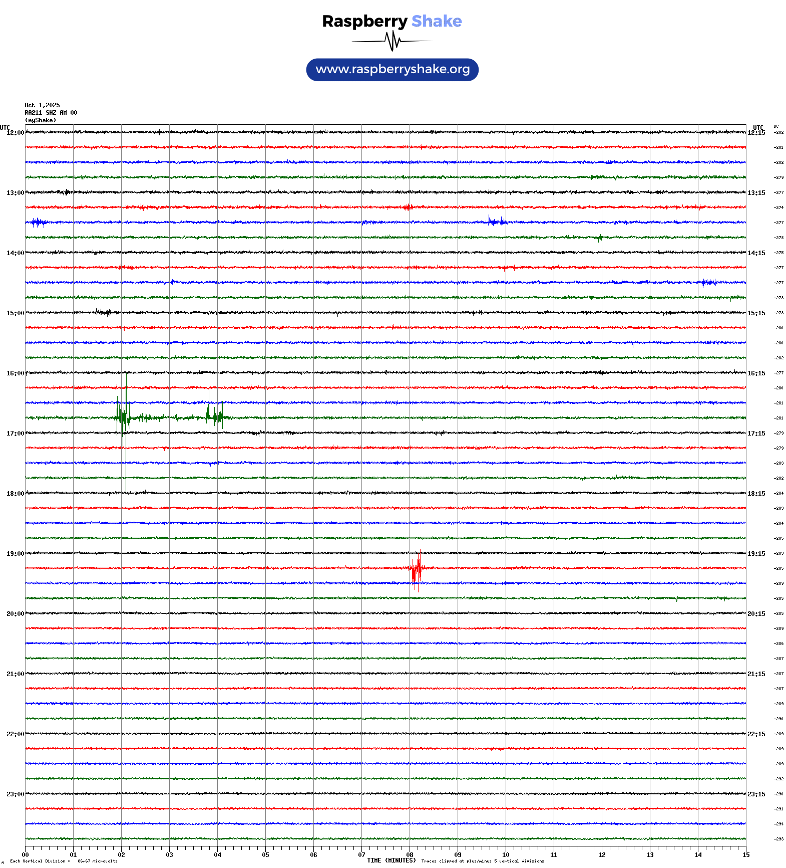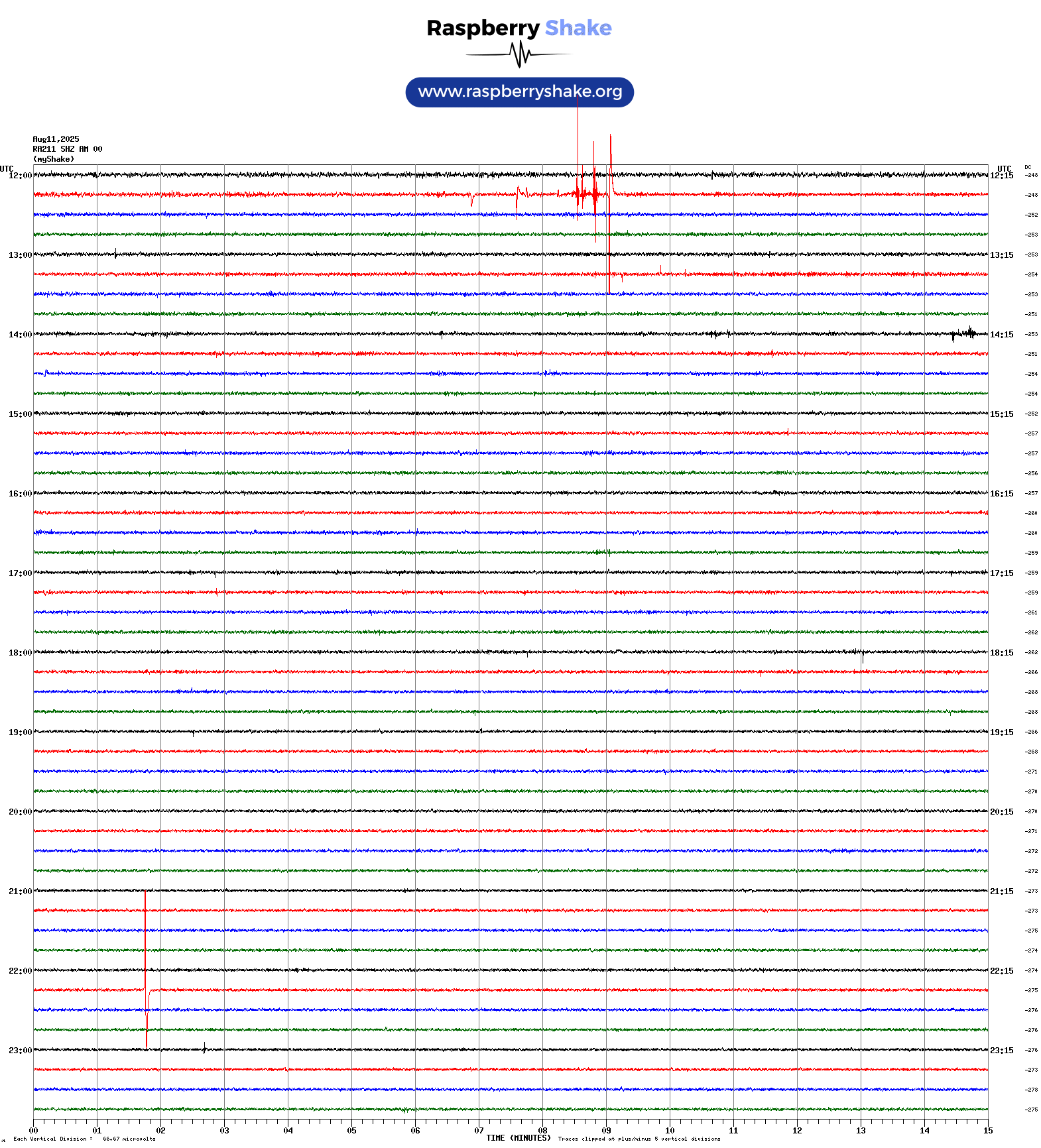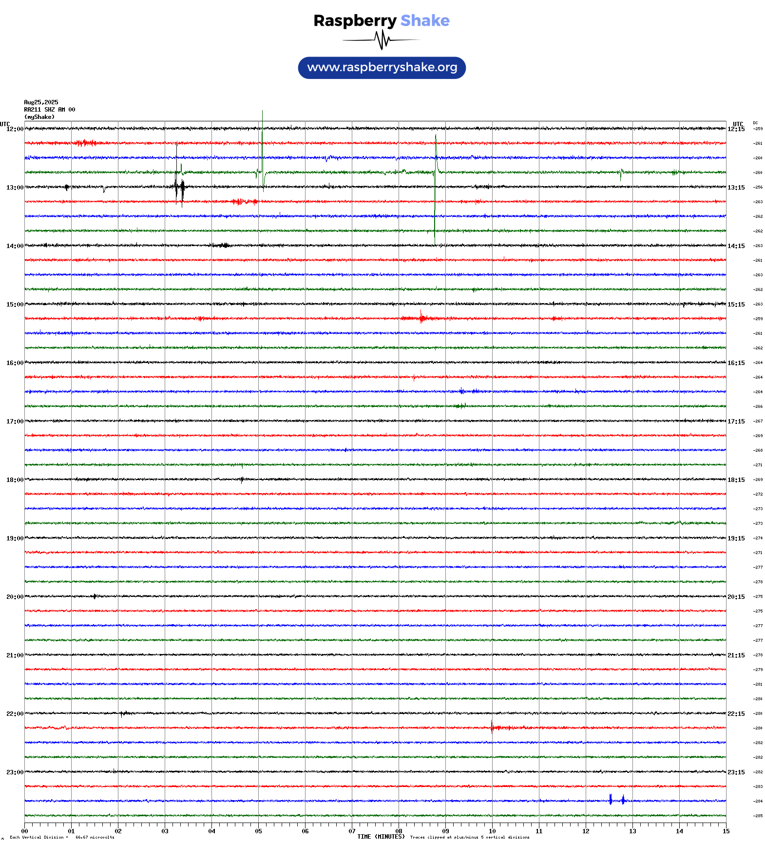 Rechts wird das Seismogramm meines Seismographen Raspberry Shake (RA211) in Naila angezeigt.
