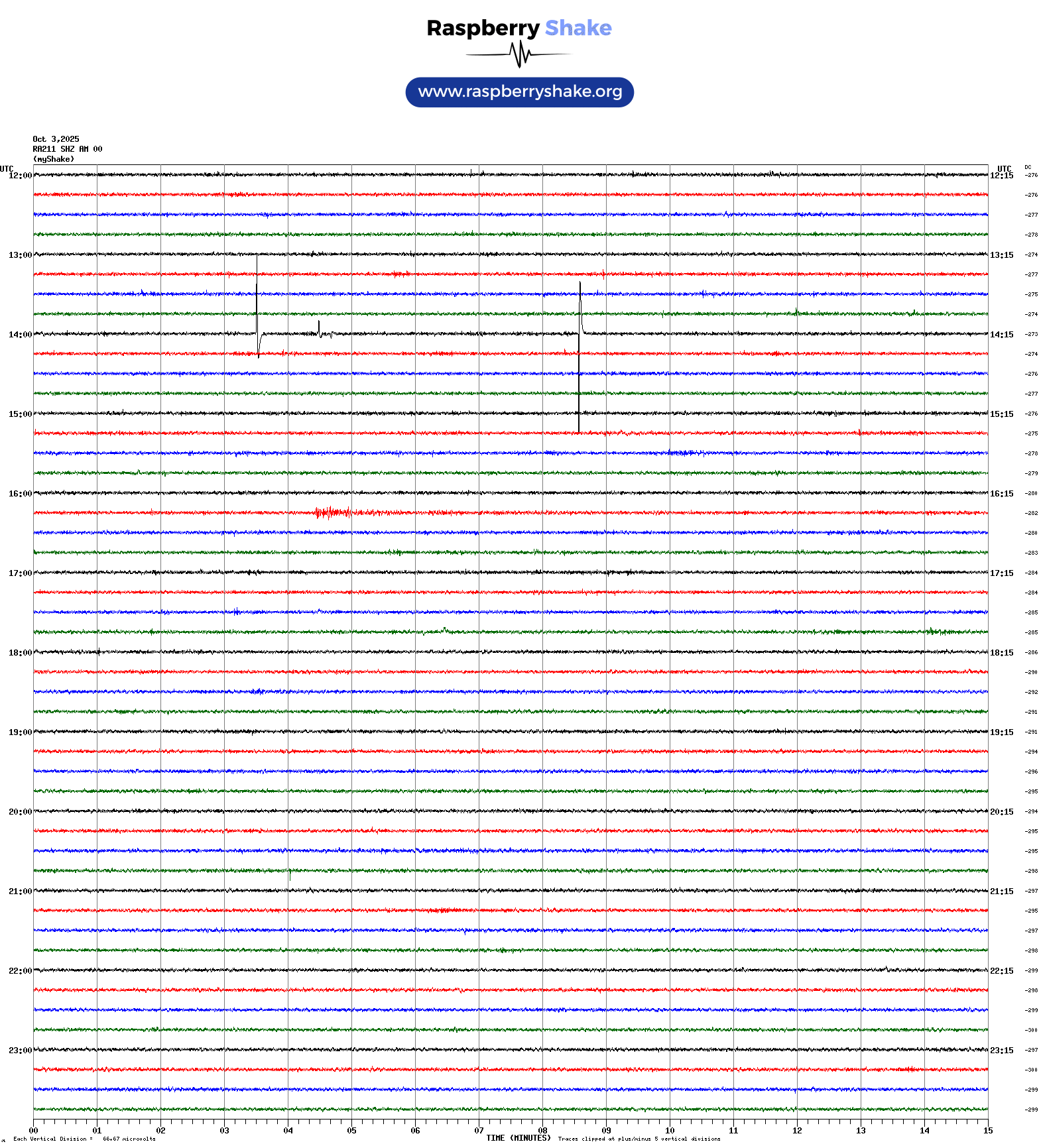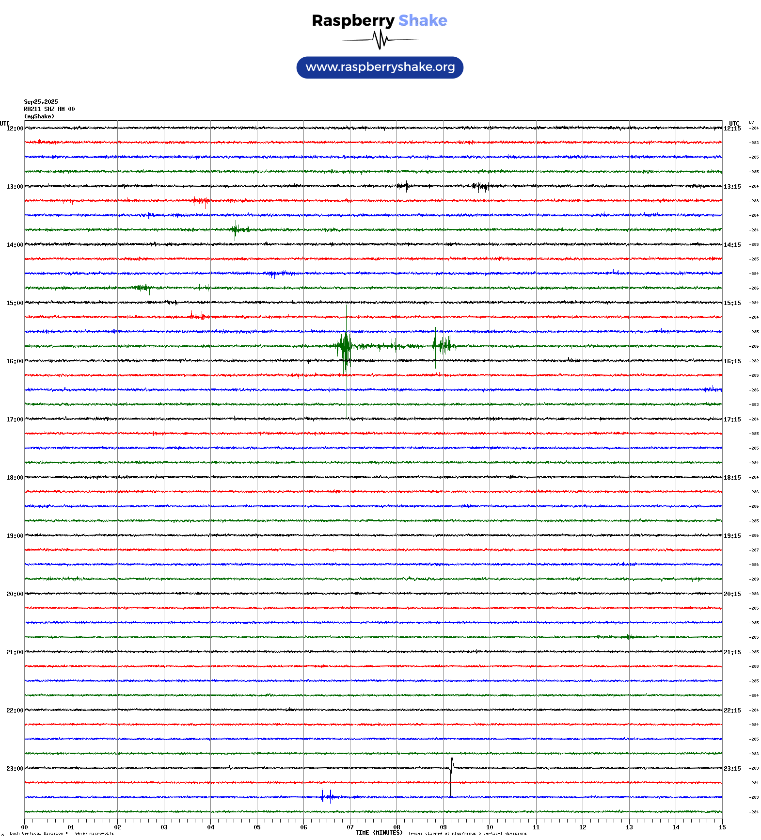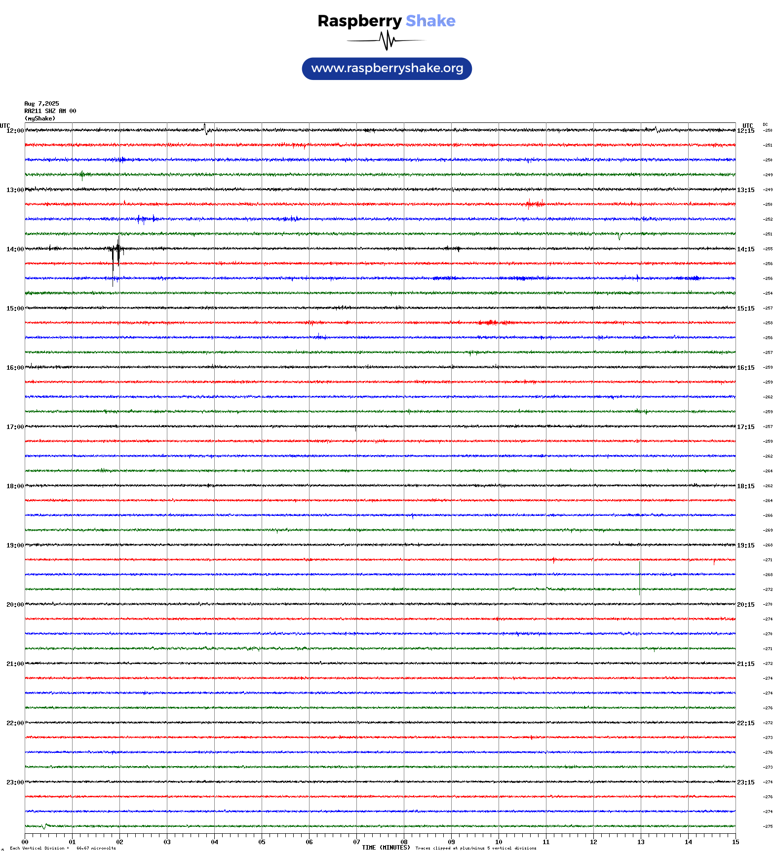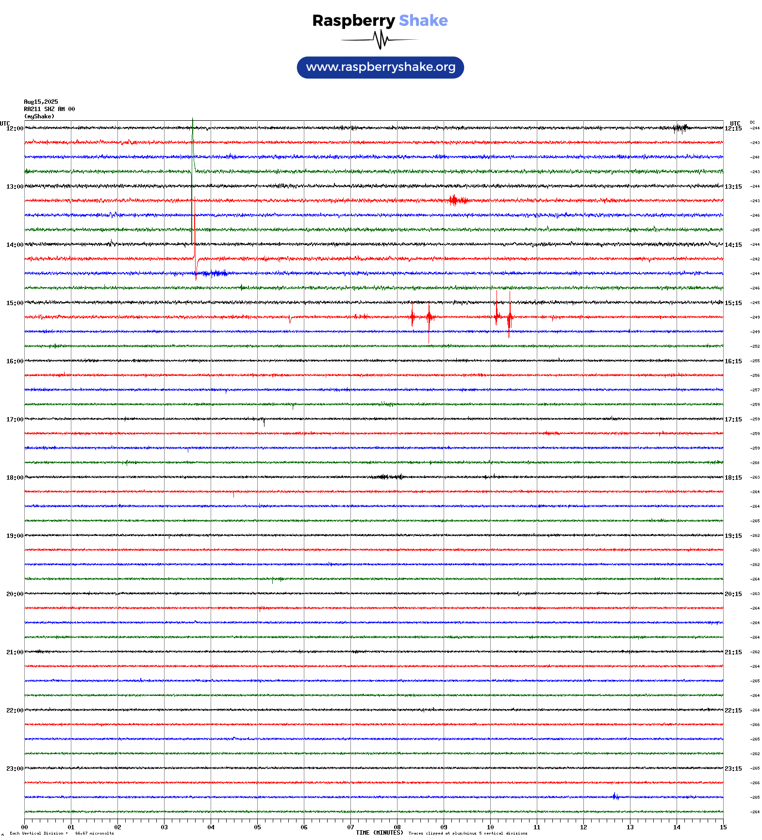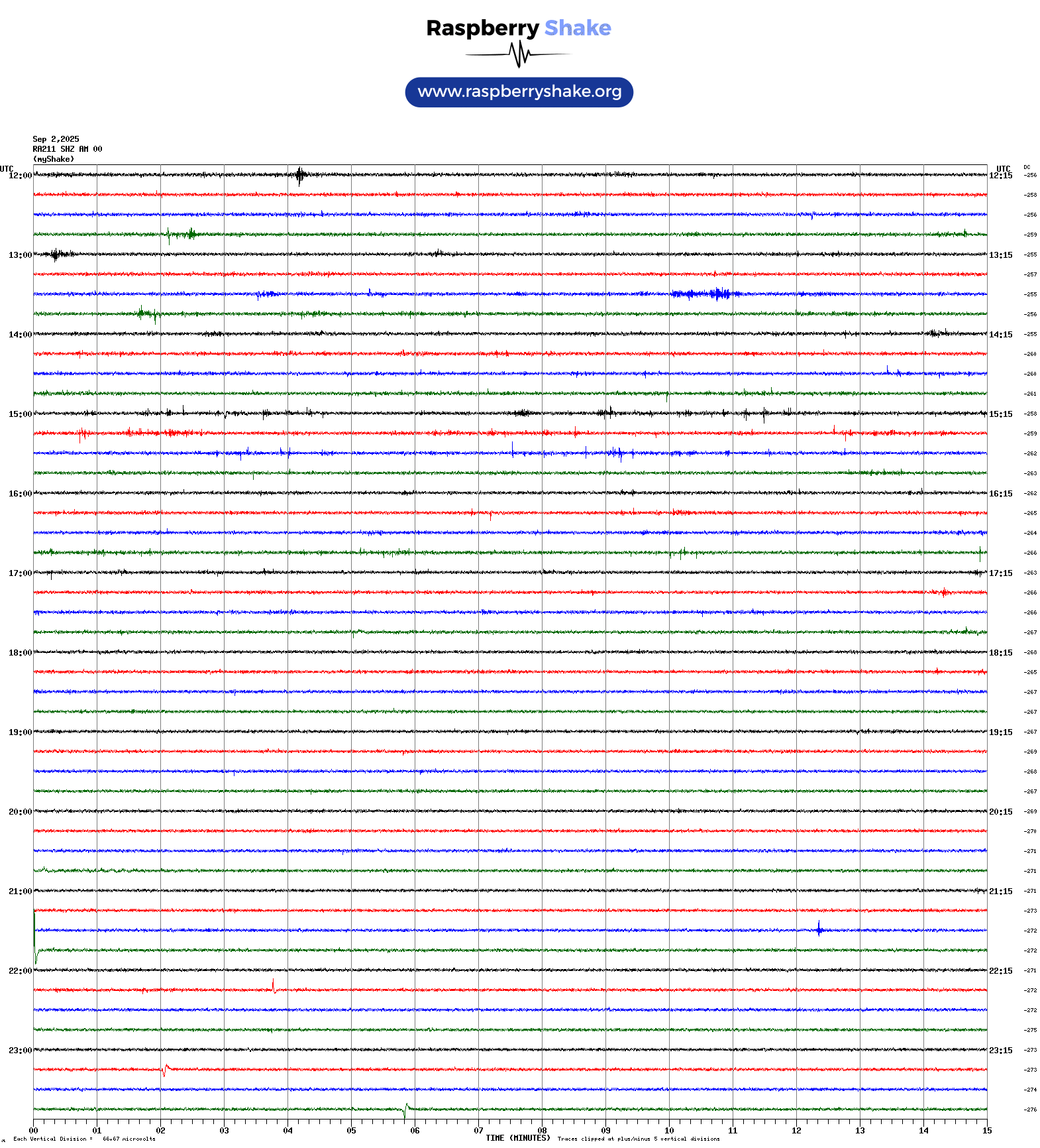 Rechts wird das Seismogramm meines Seismographen Raspberry Shake (RA211) in Naila angezeigt.