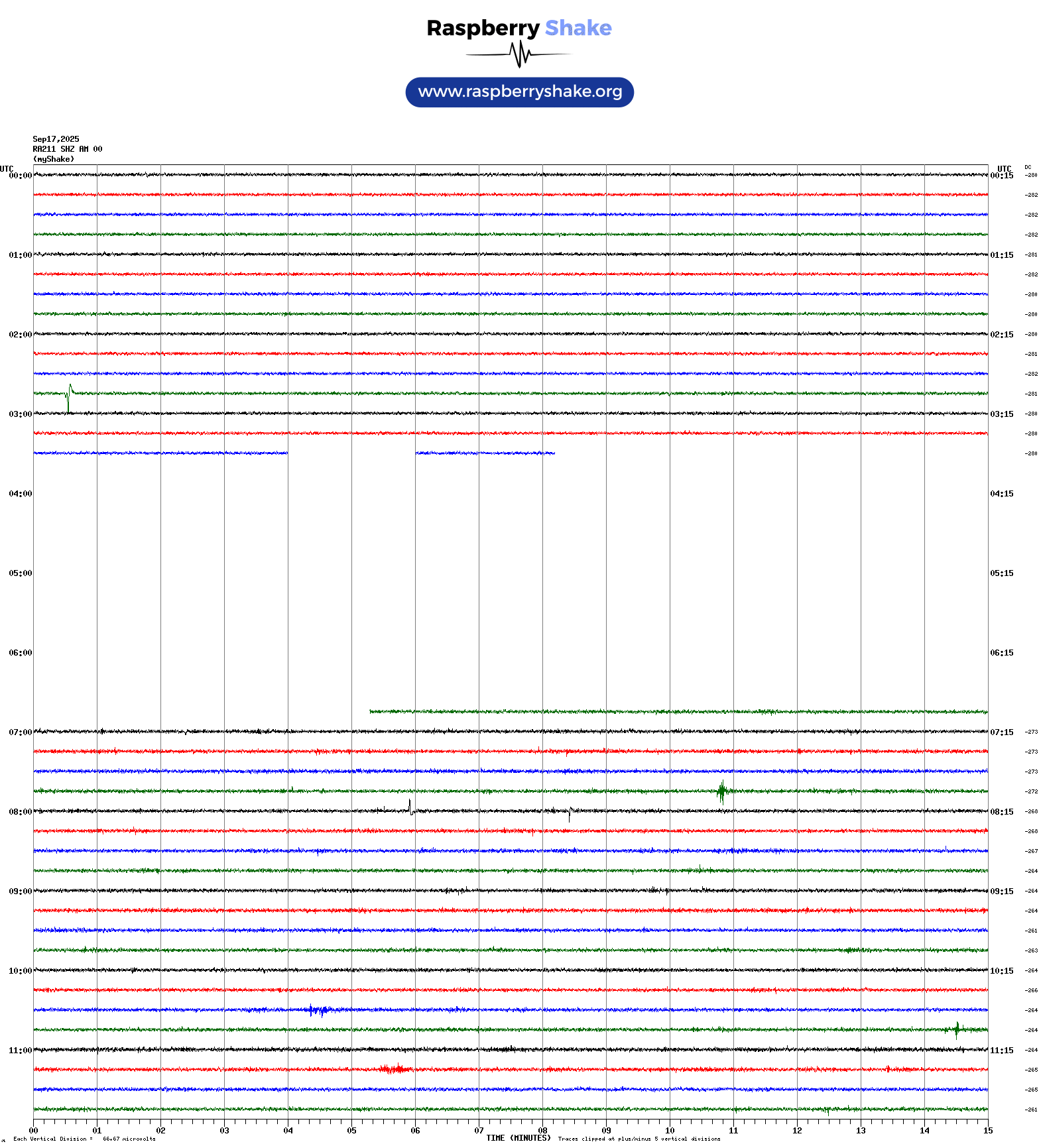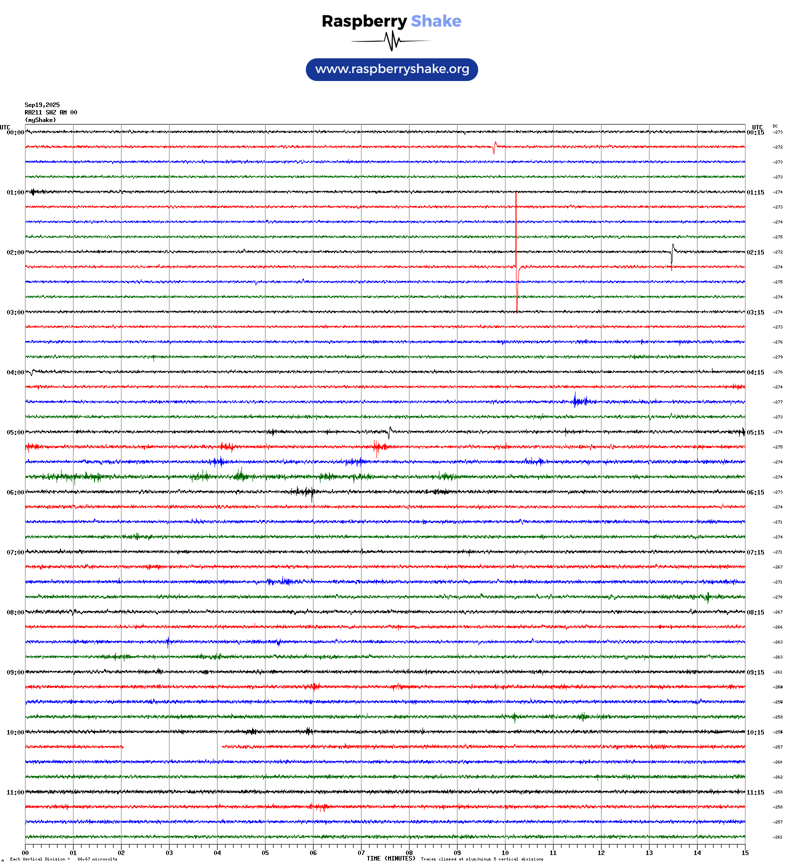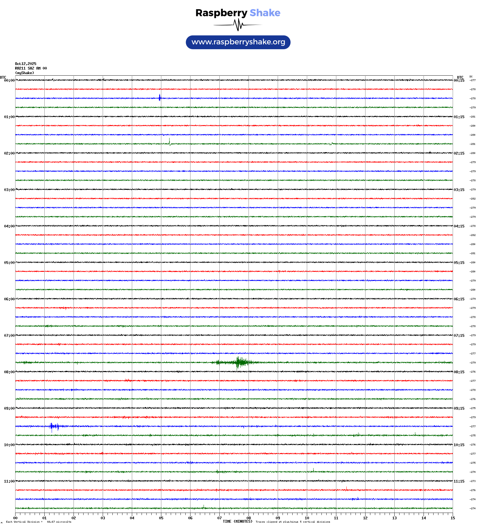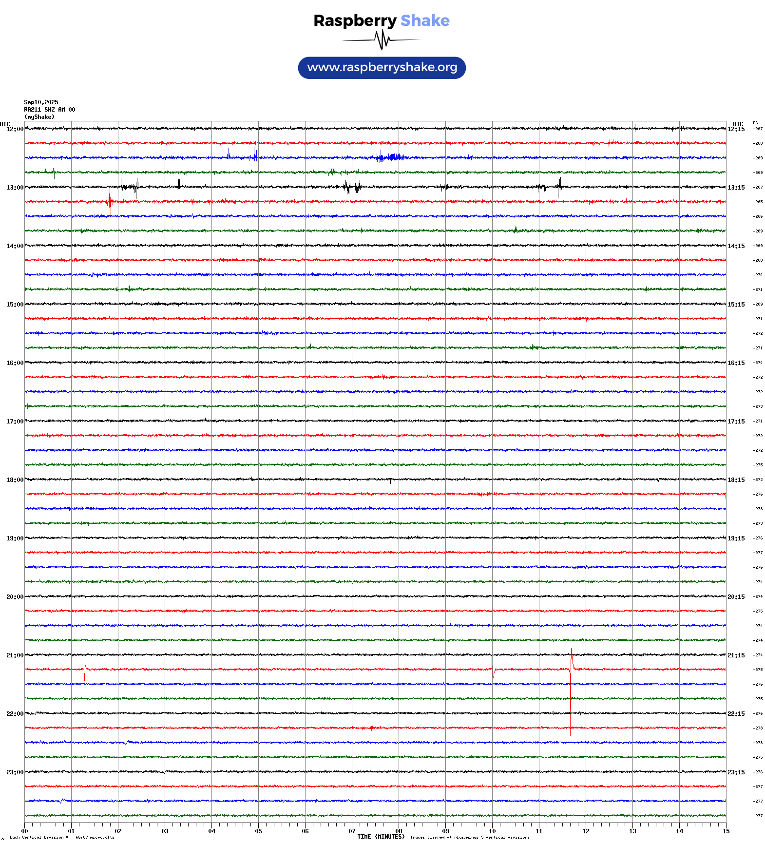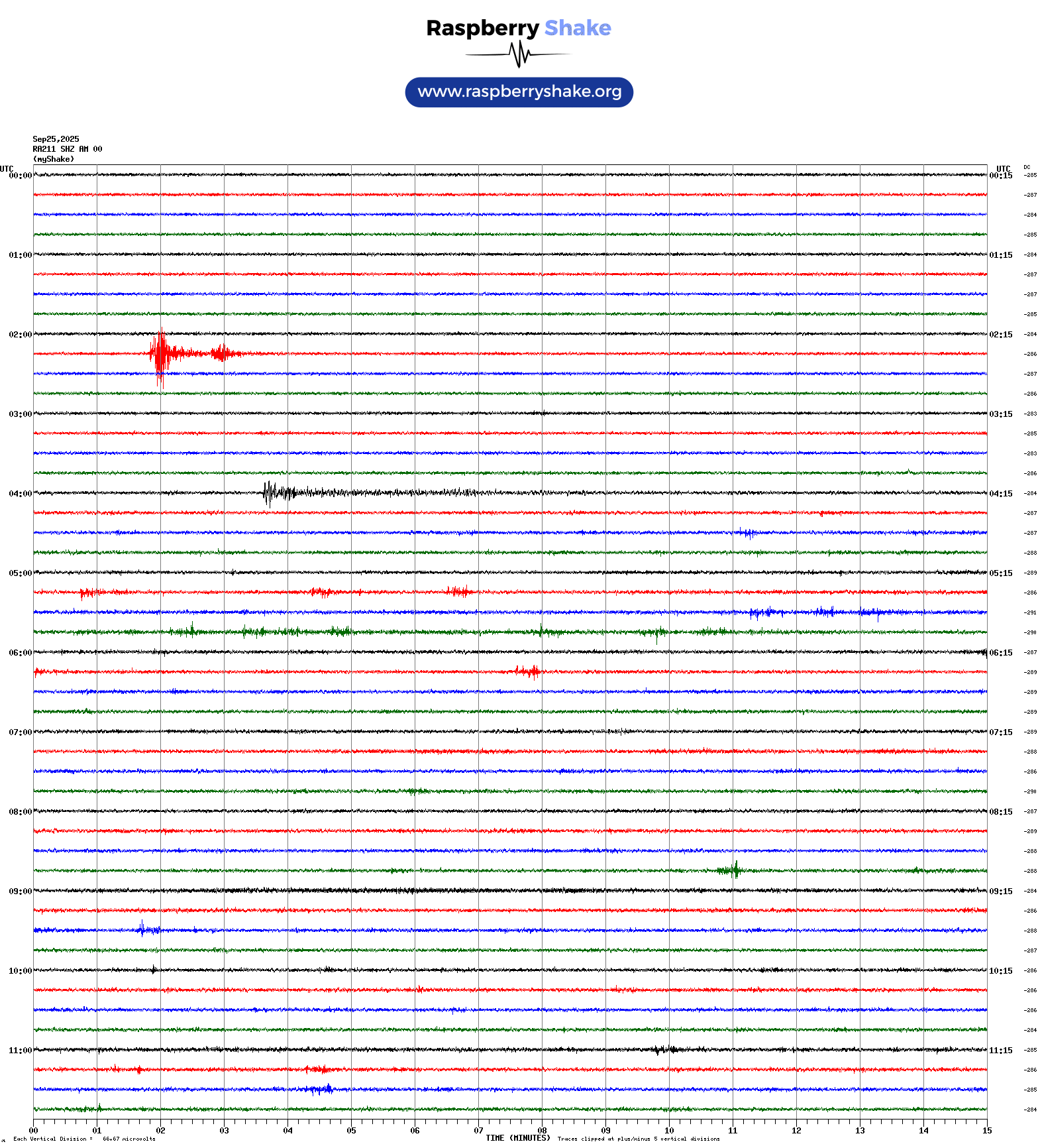 Rechts wird das Seismogramm meines Seismographen Raspberry Shake (RA211) in Naila angezeigt.