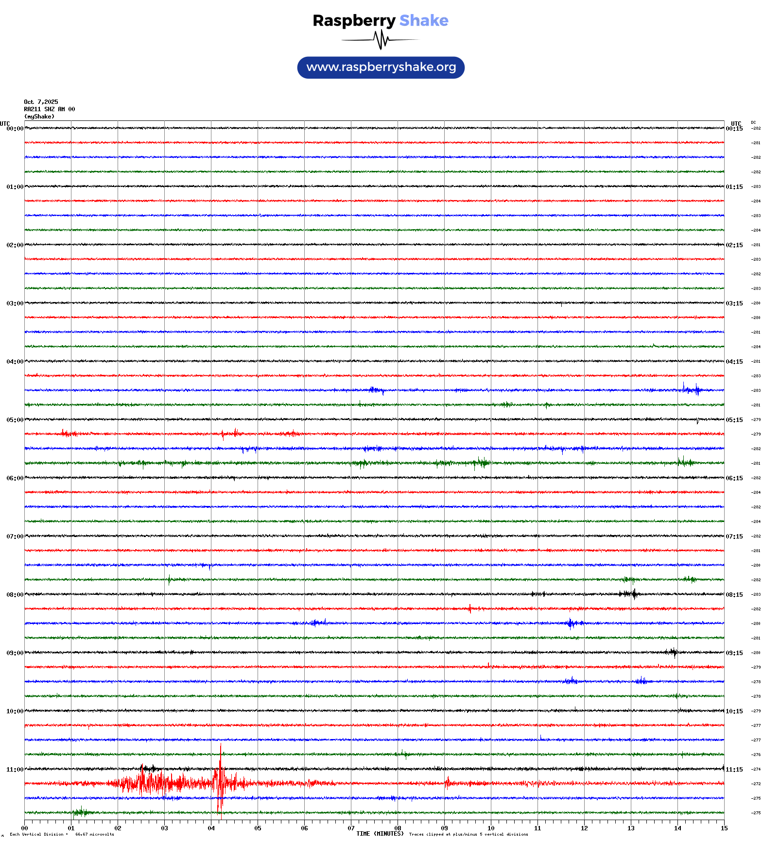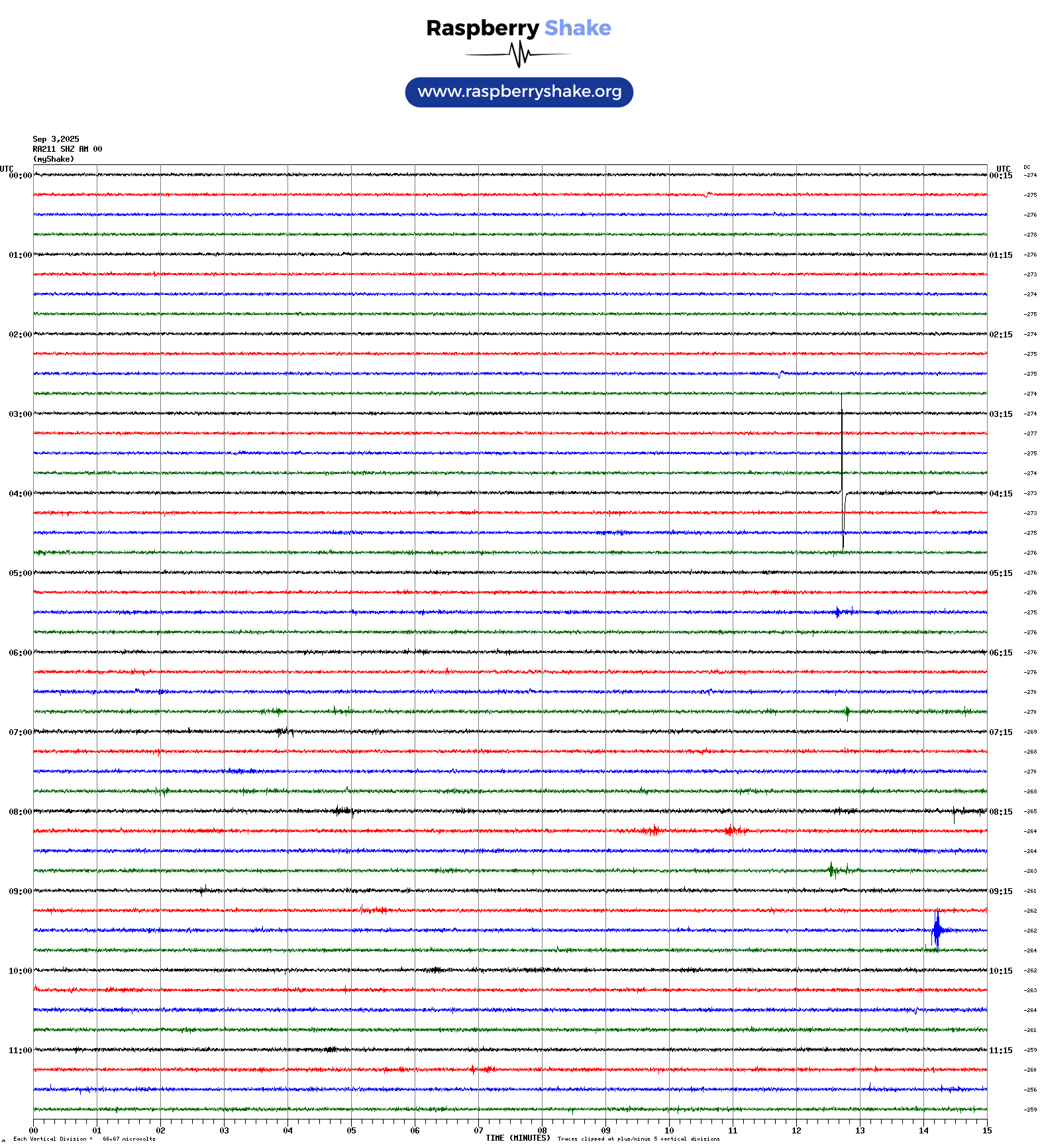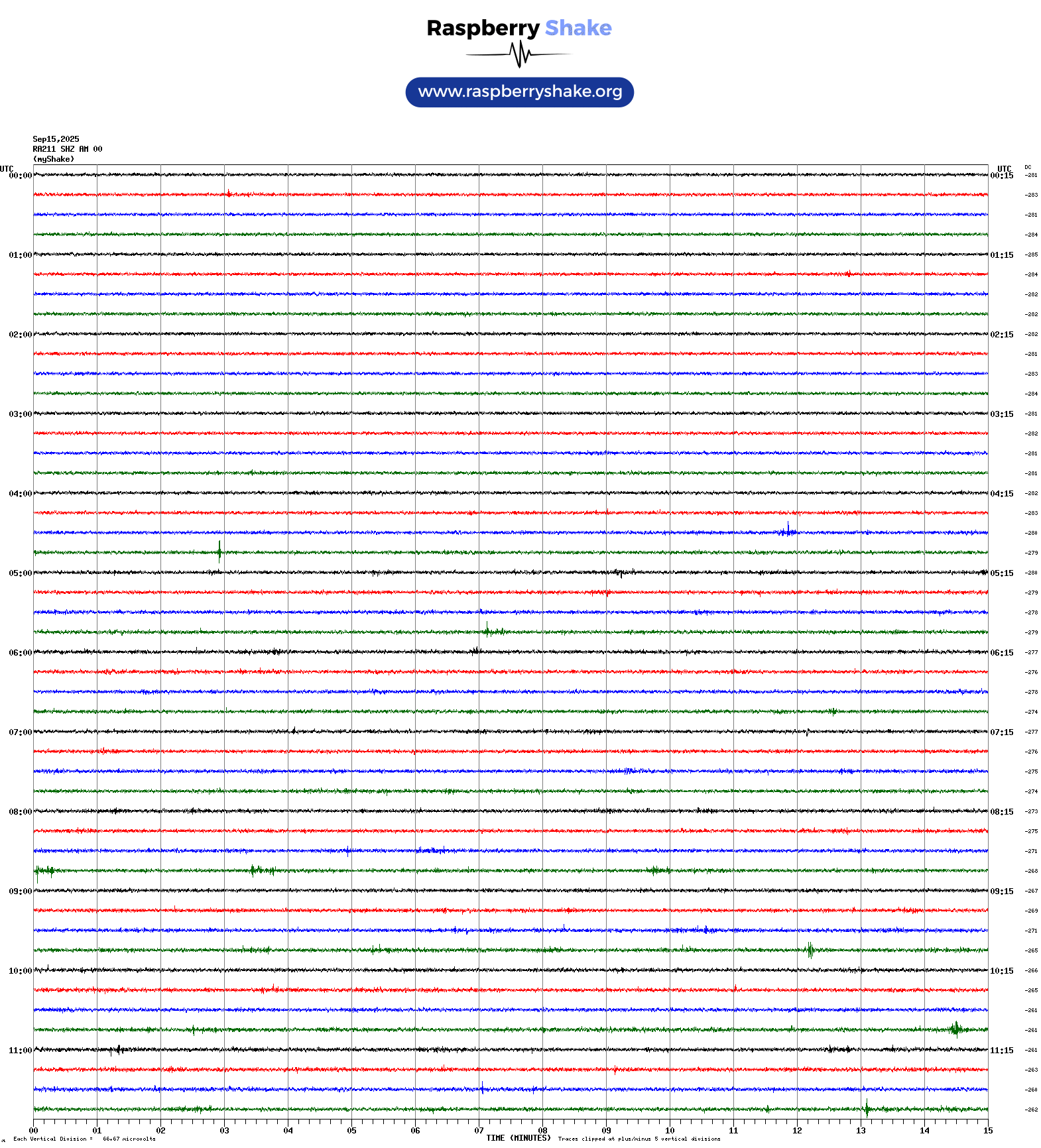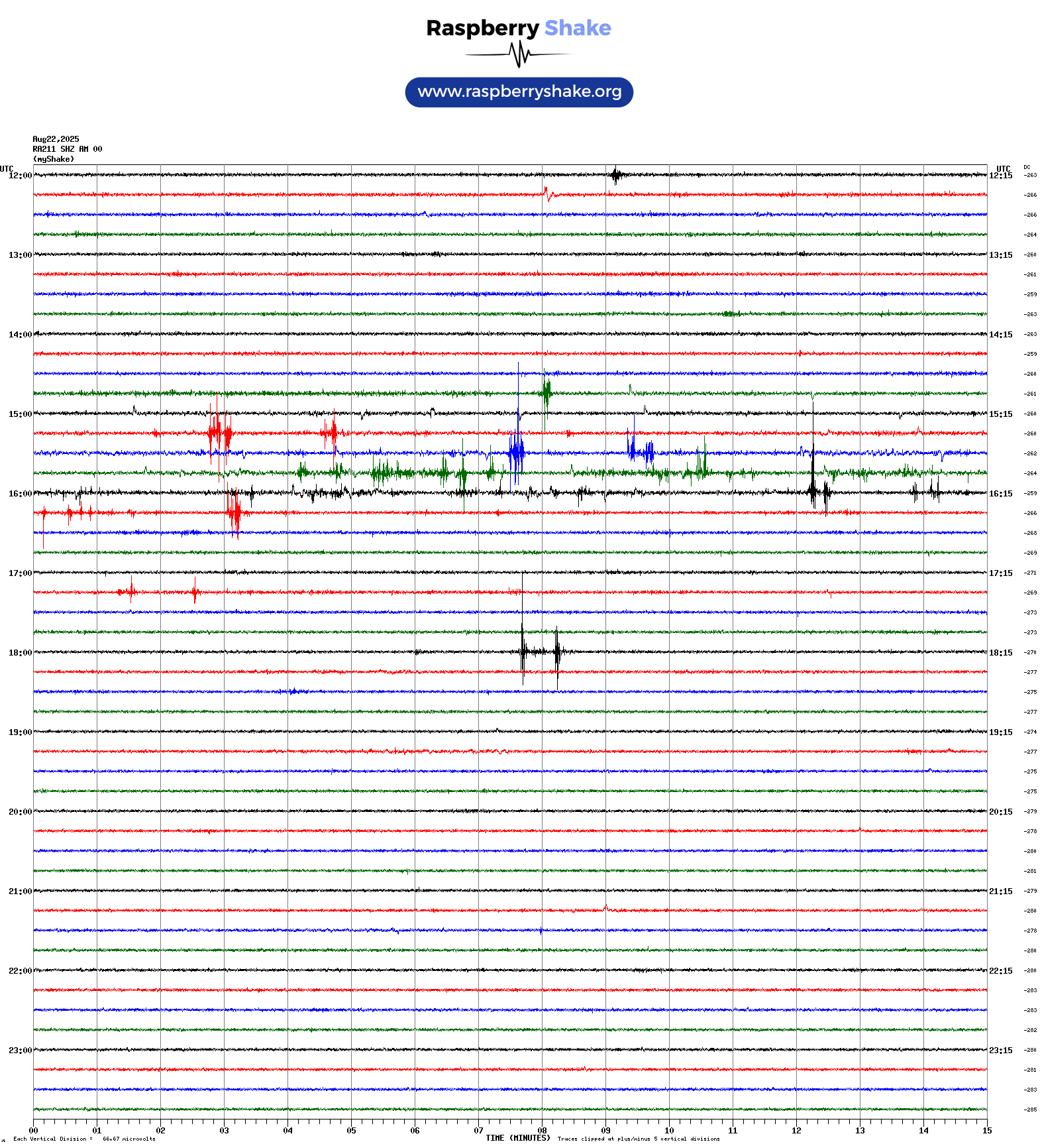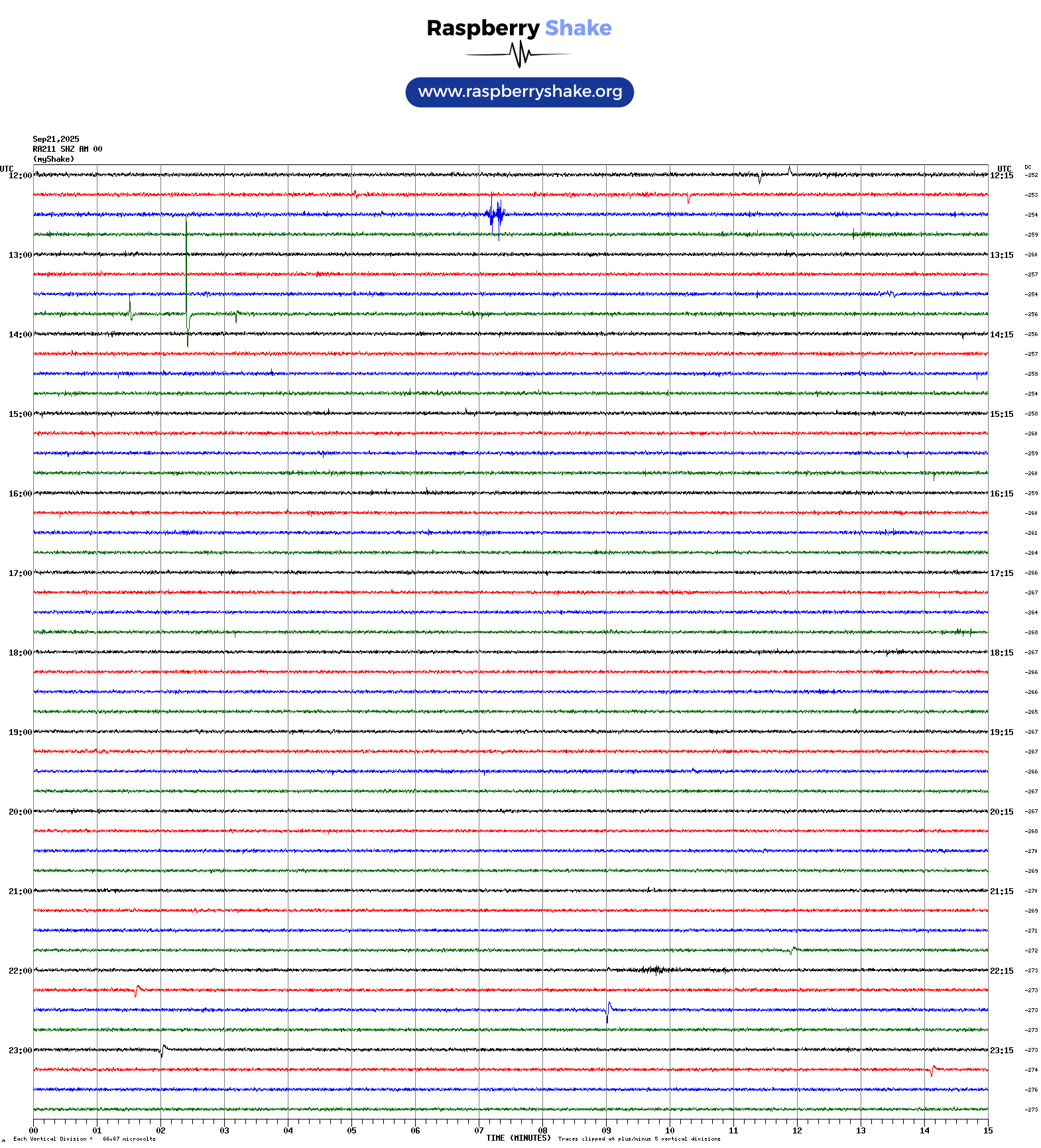 Rechts wird das Seismogramm meines Seismographen Raspberry Shake (RA211) in Naila angezeigt.