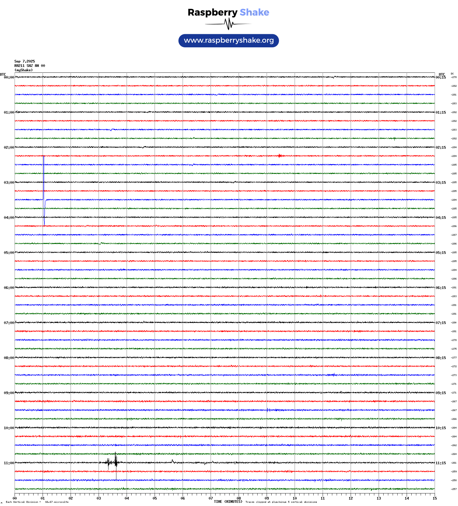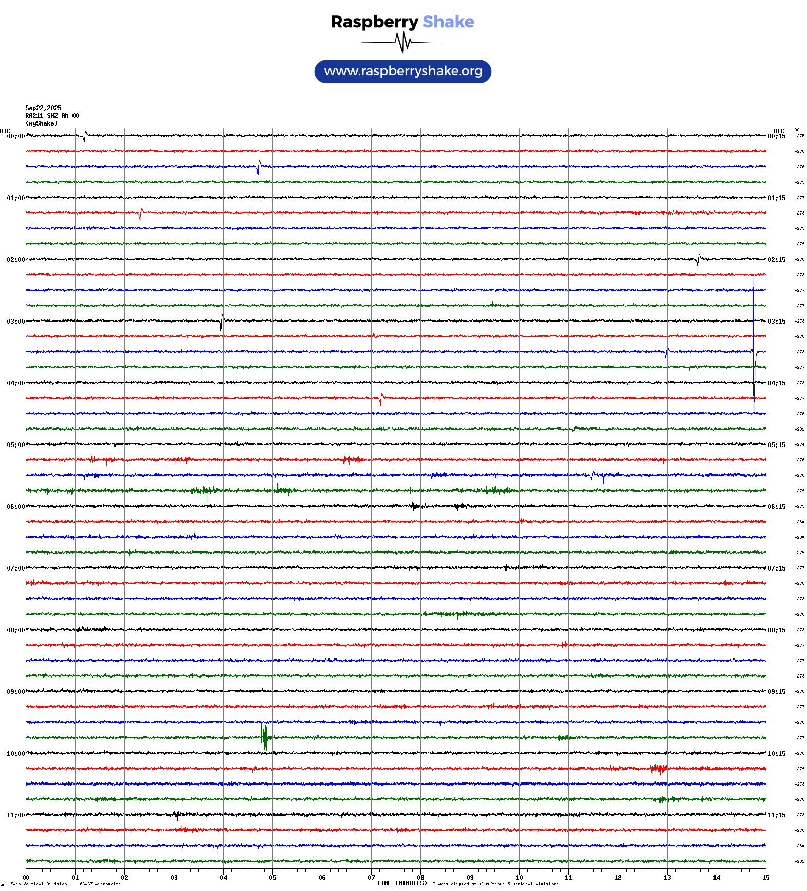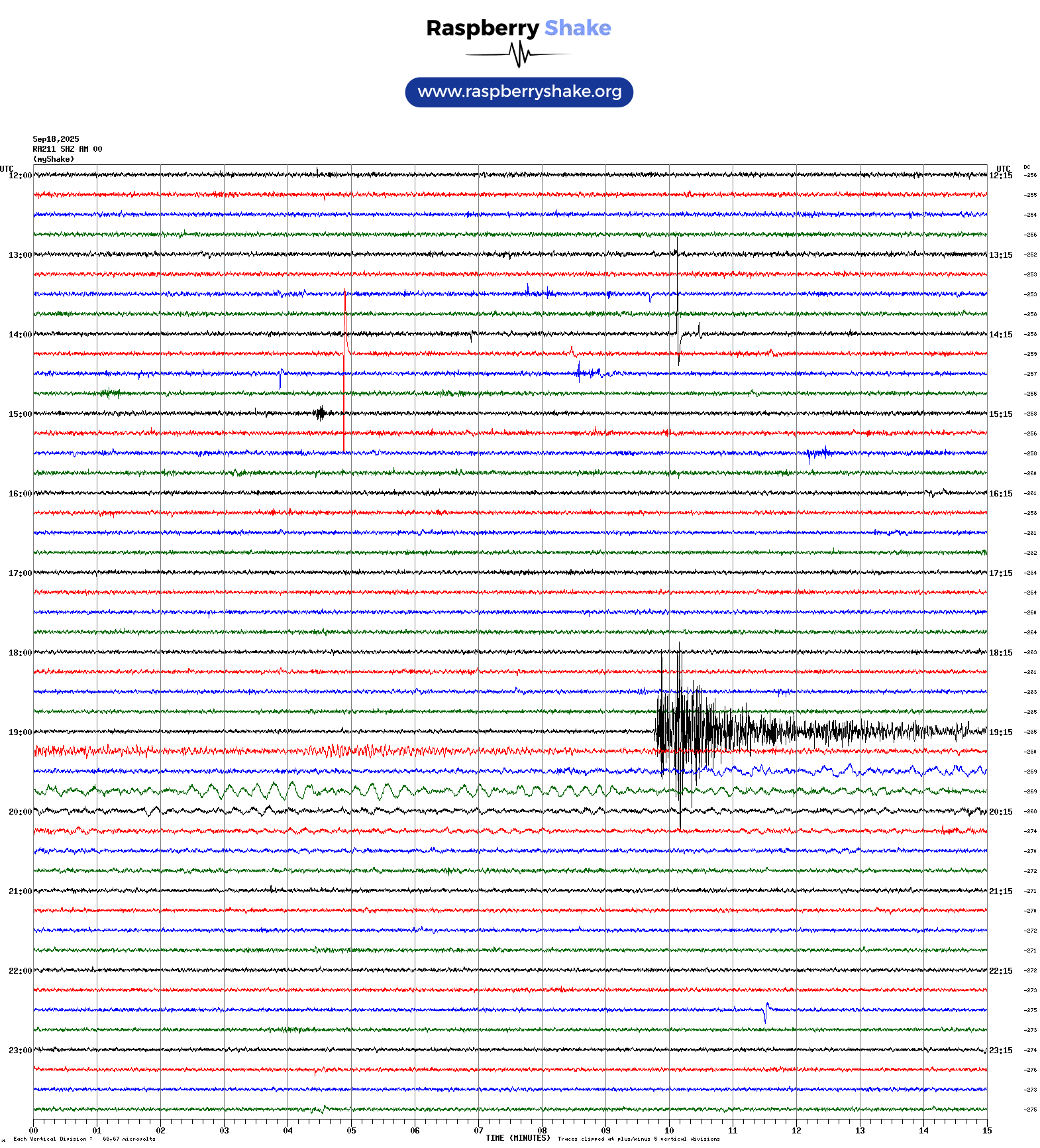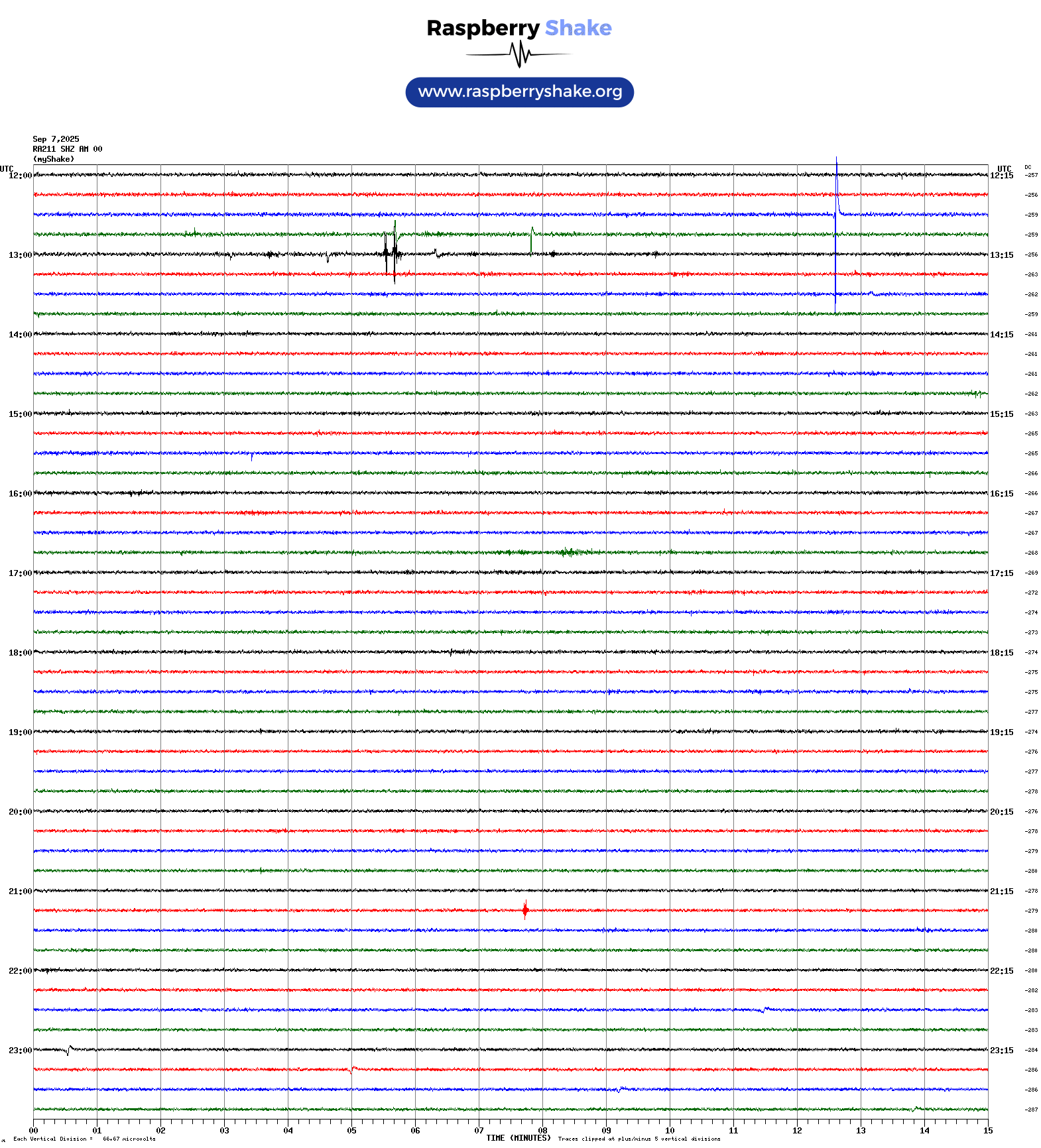 Rechts wird das Seismogramm meines Seismographen Raspberry Shake (RA211) in Naila angezeigt.