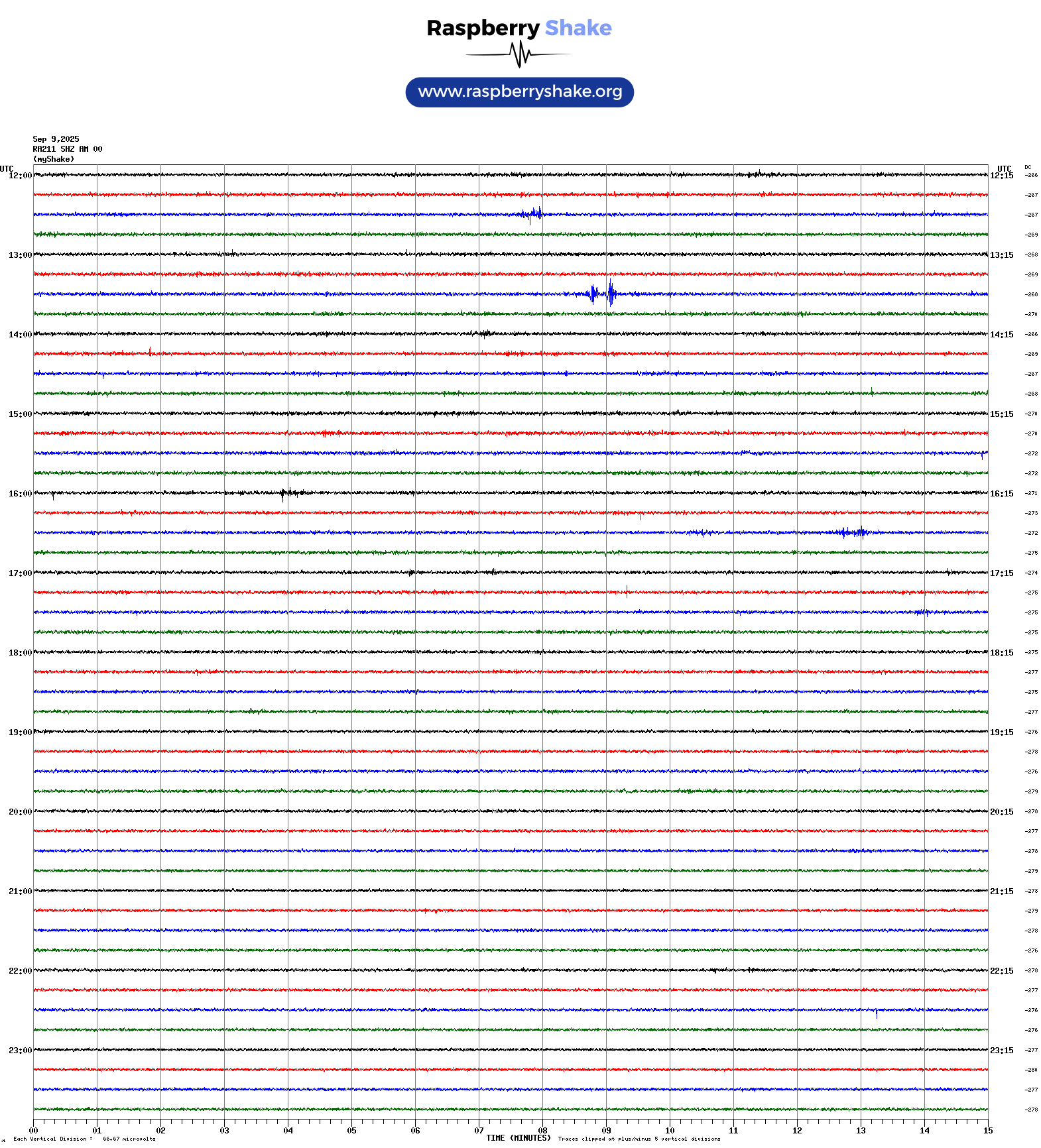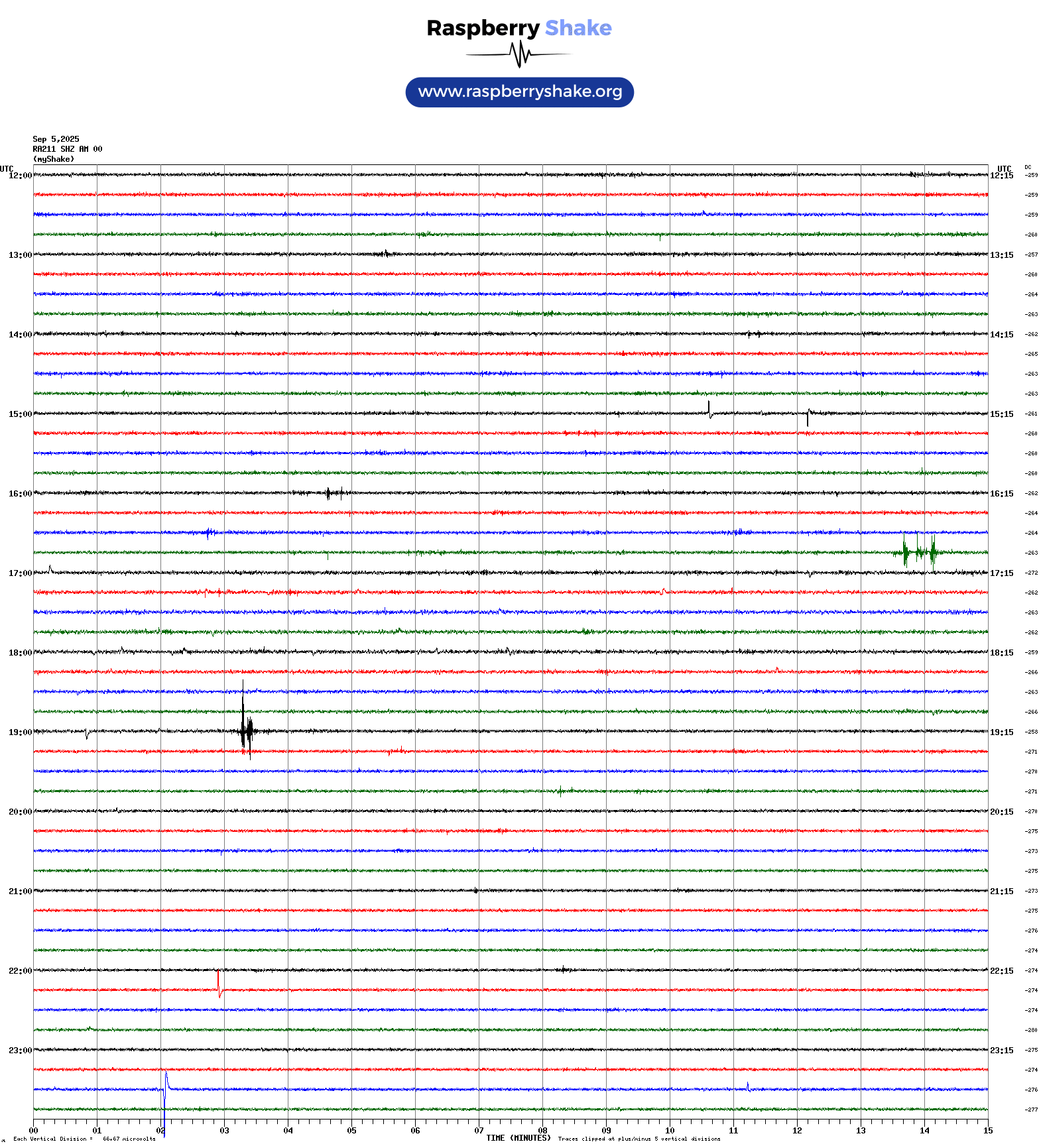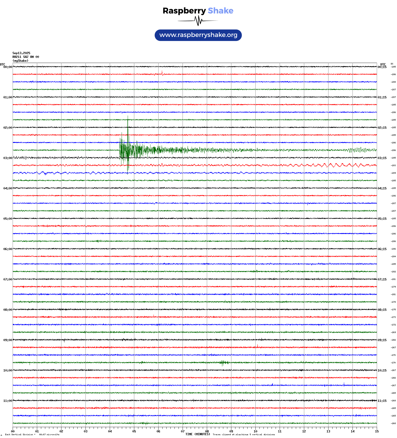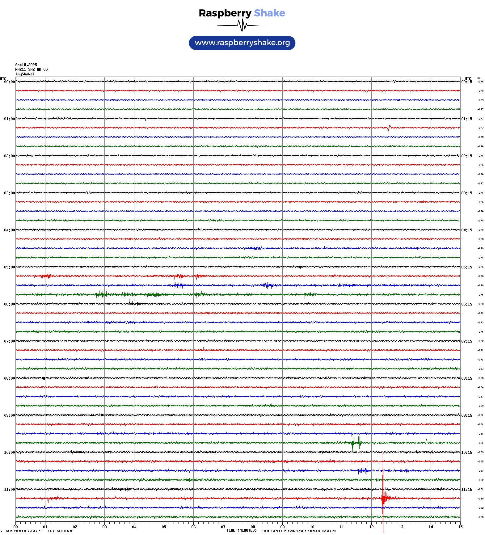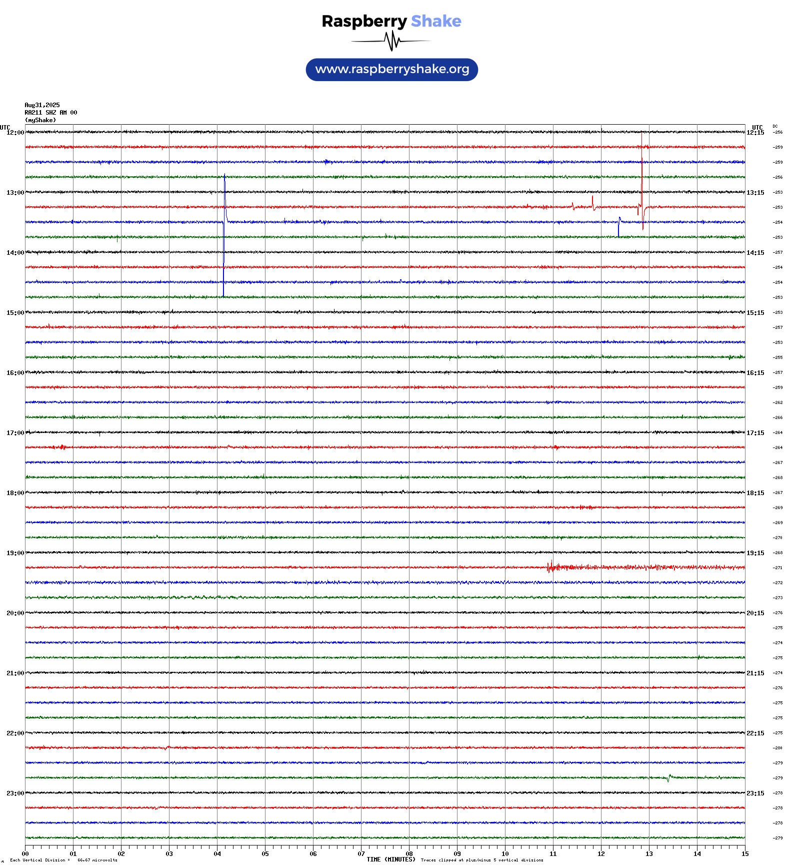 Rechts wird das Seismogramm meines Seismographen Raspberry Shake (RA211) in Naila angezeigt.