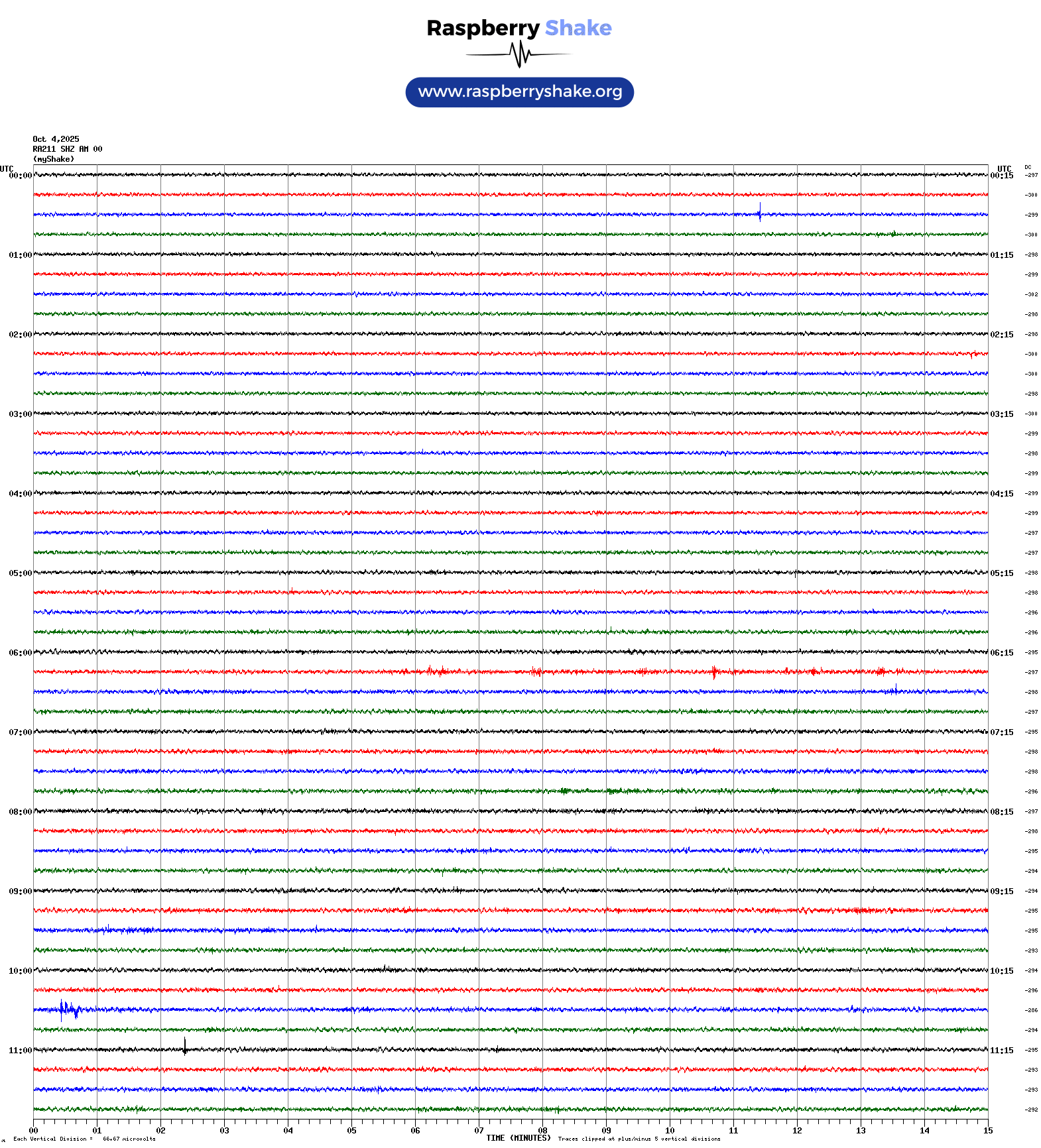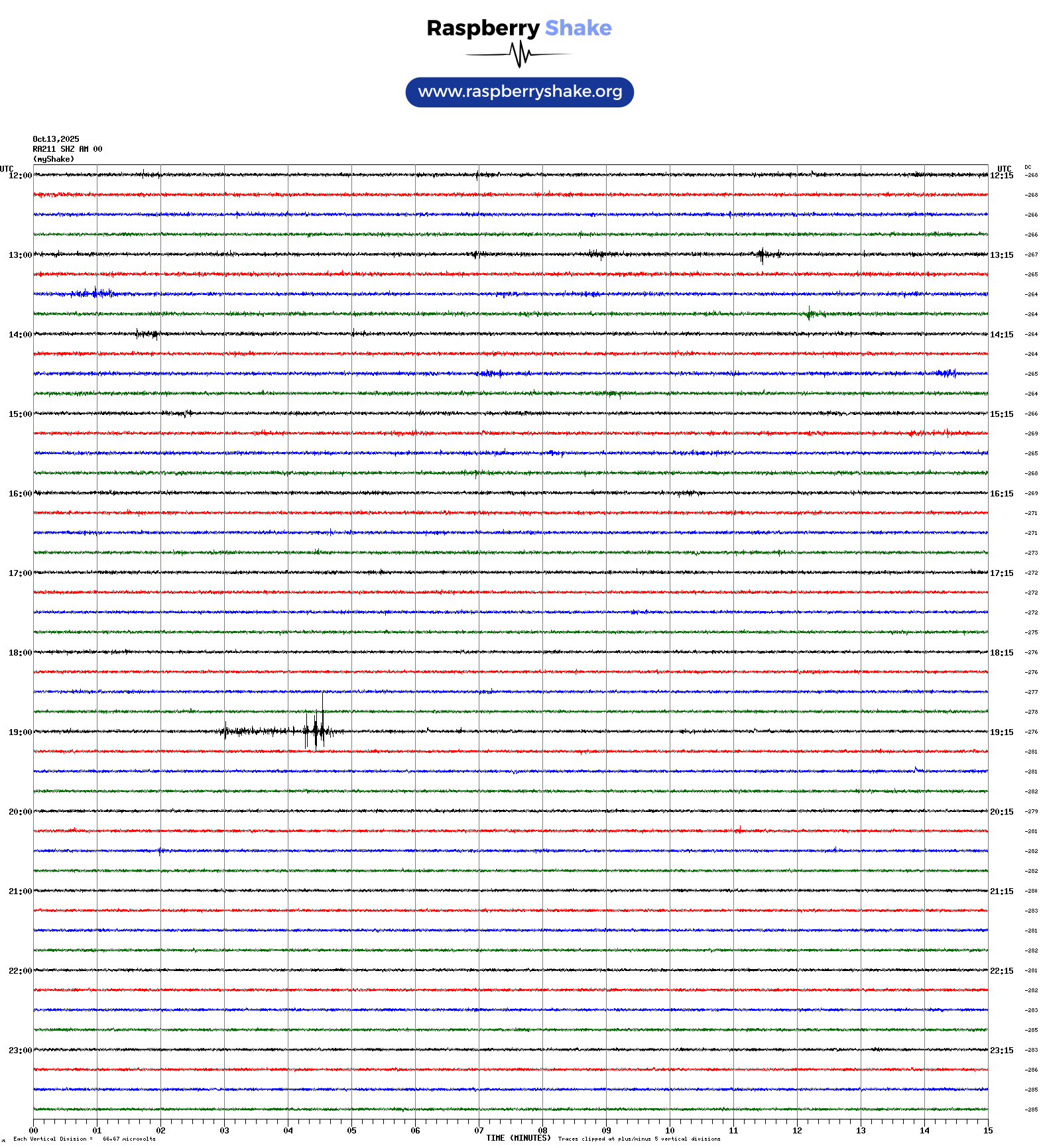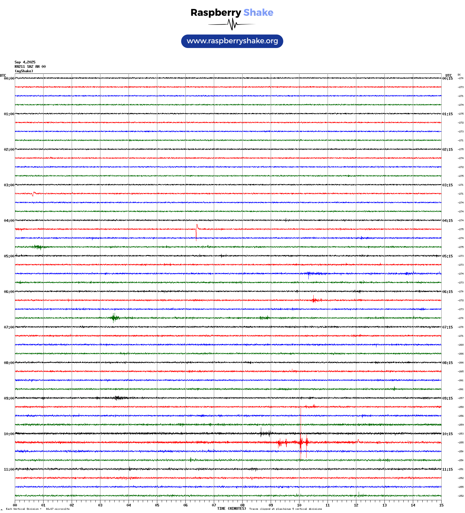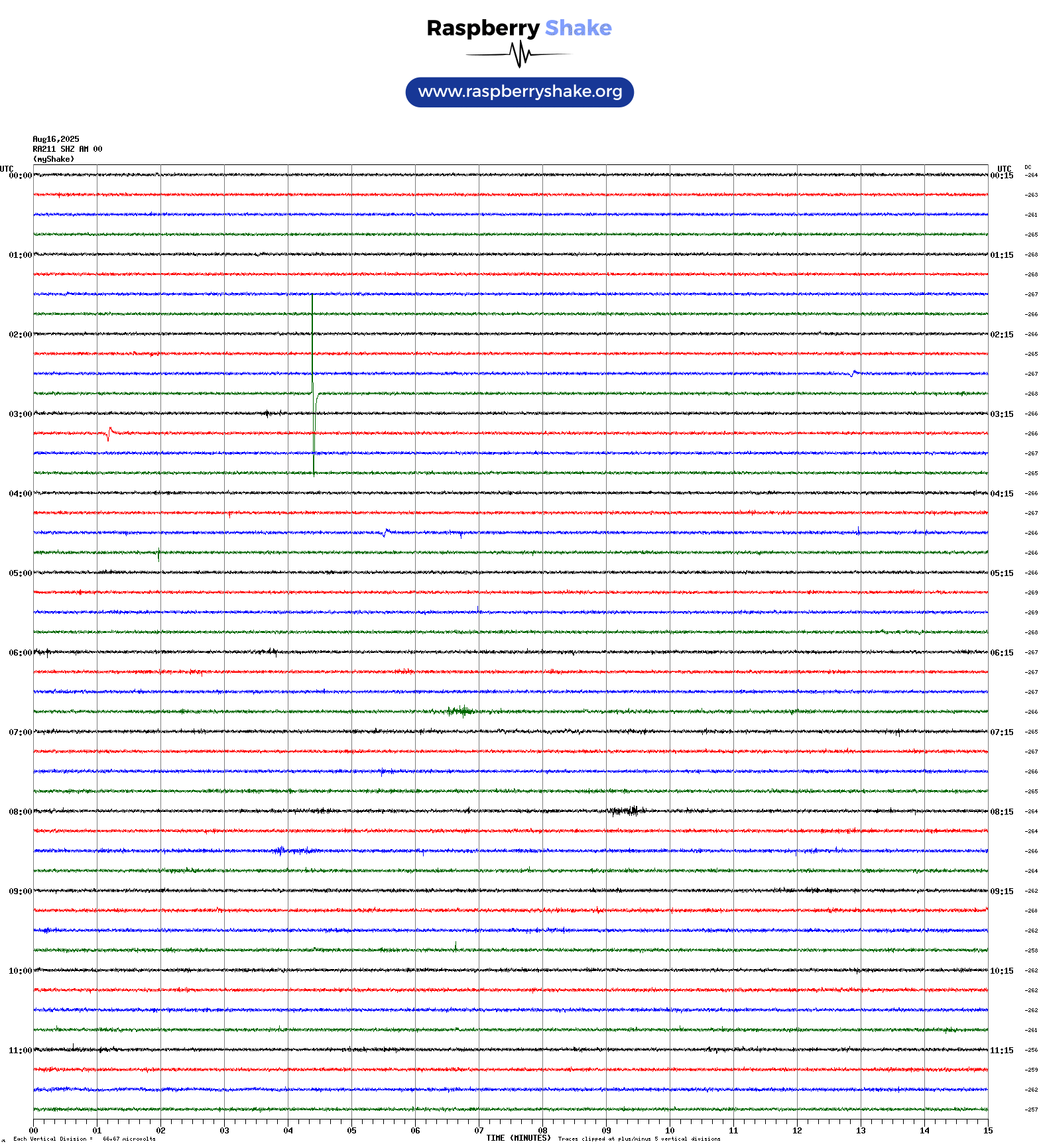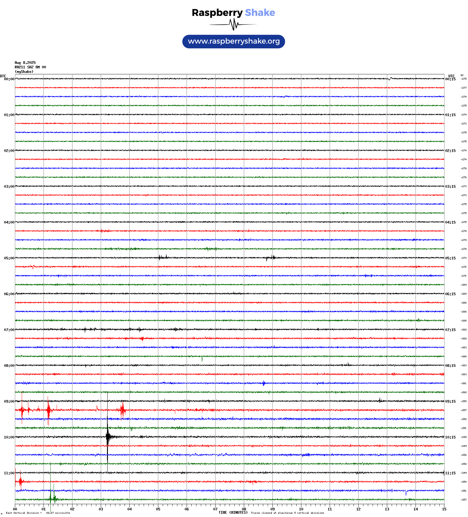 Rechts wird das Seismogramm meines Seismographen Raspberry Shake (RA211) in Naila angezeigt.