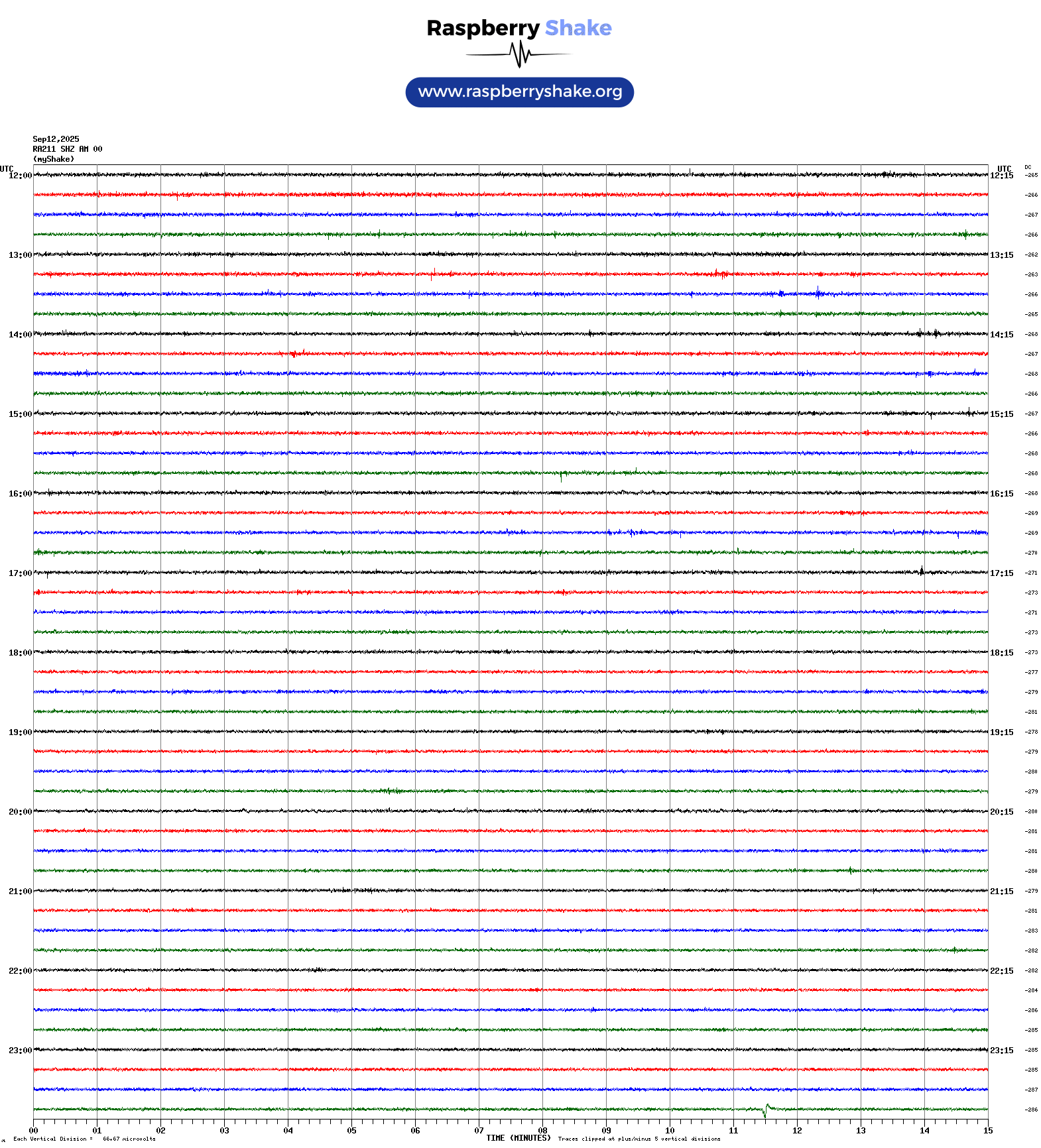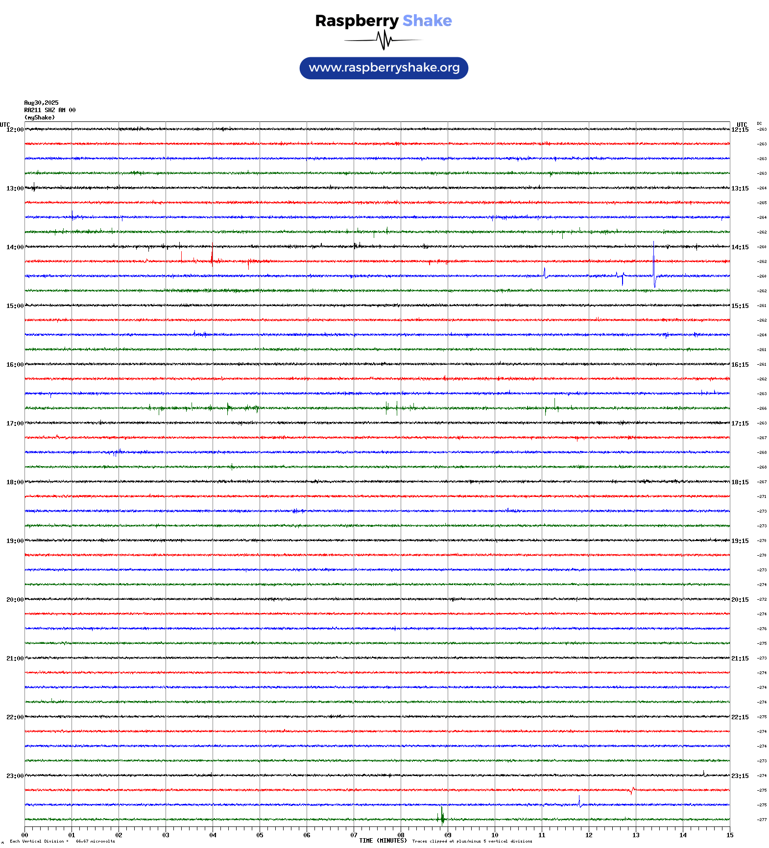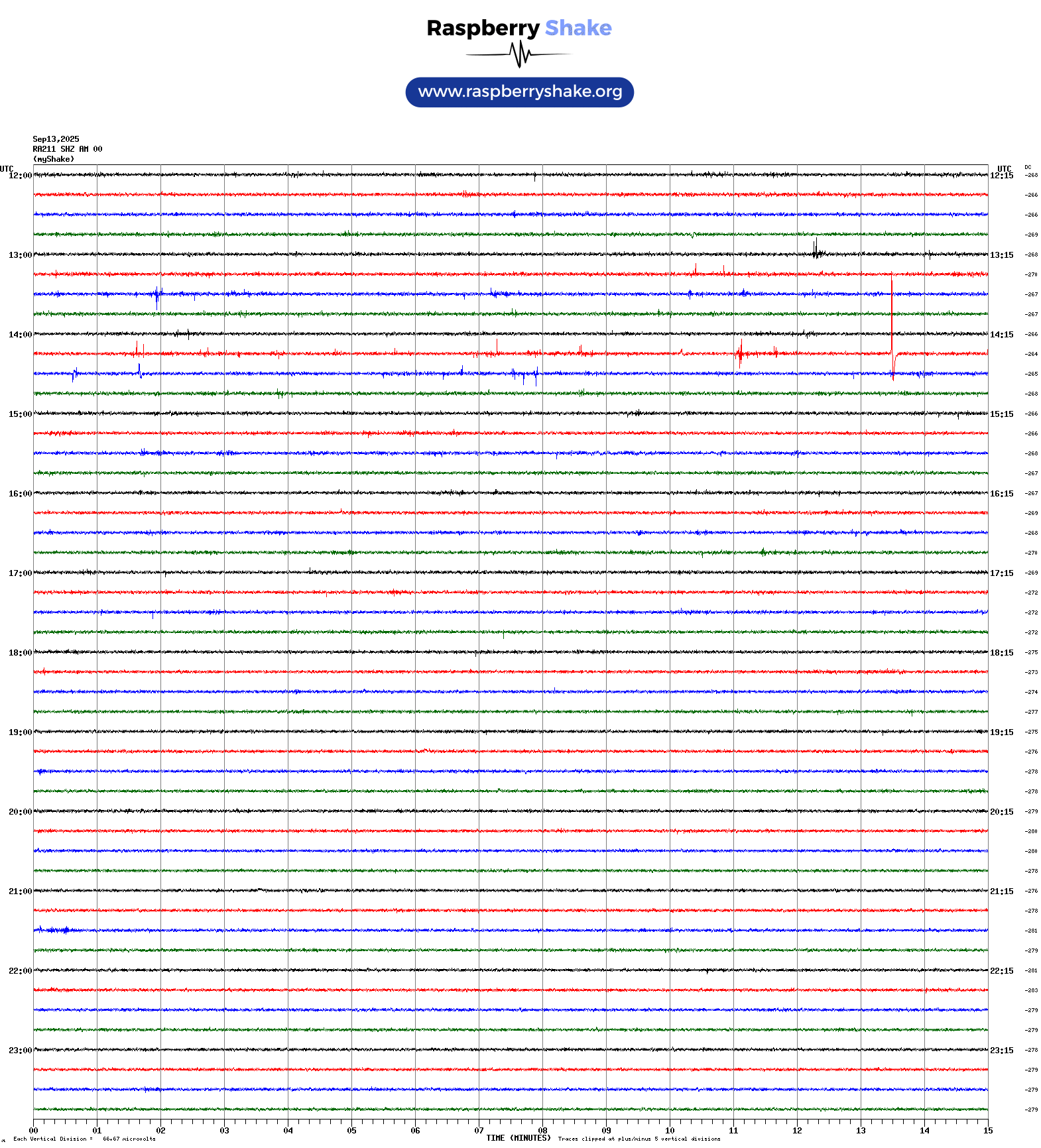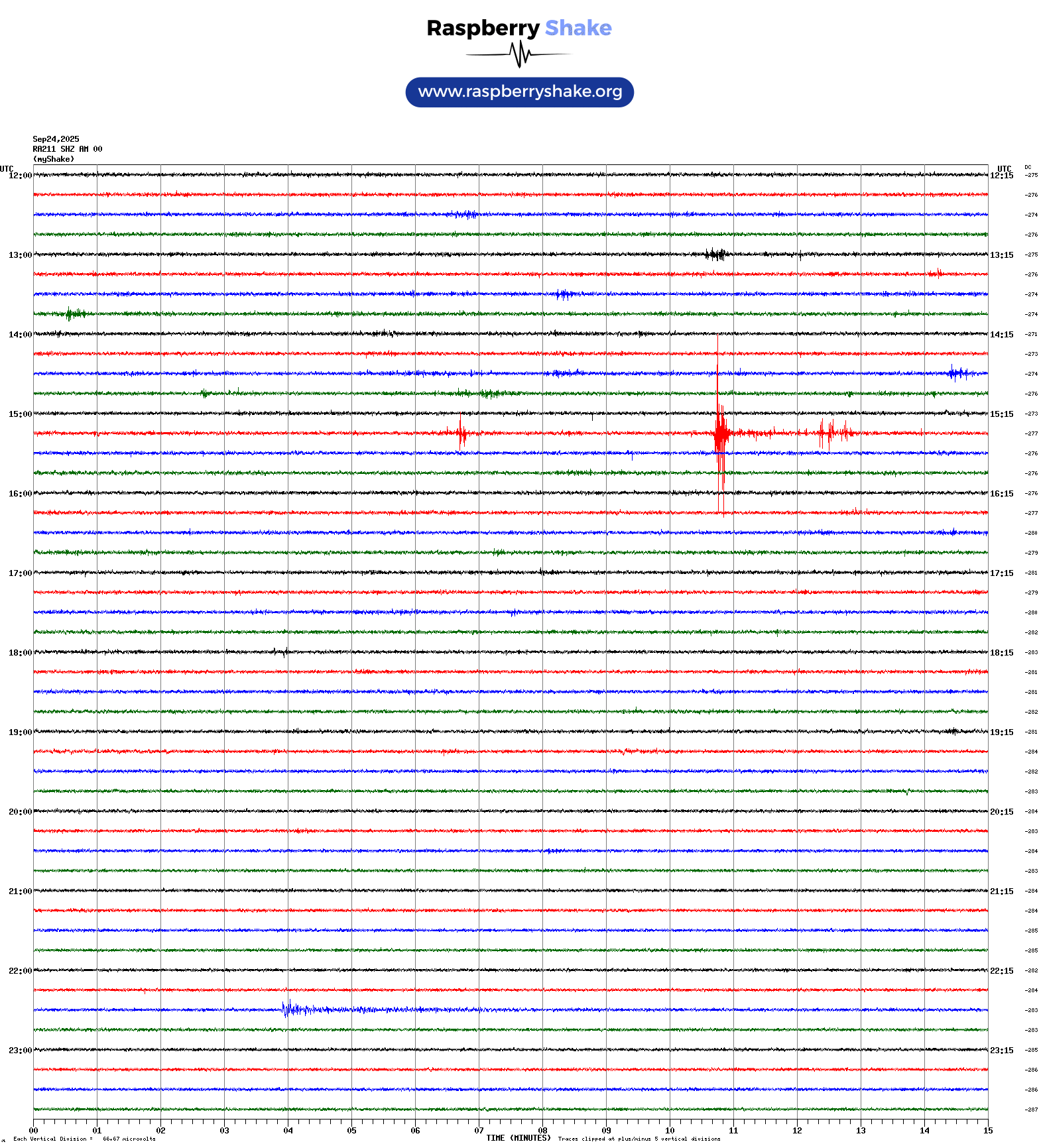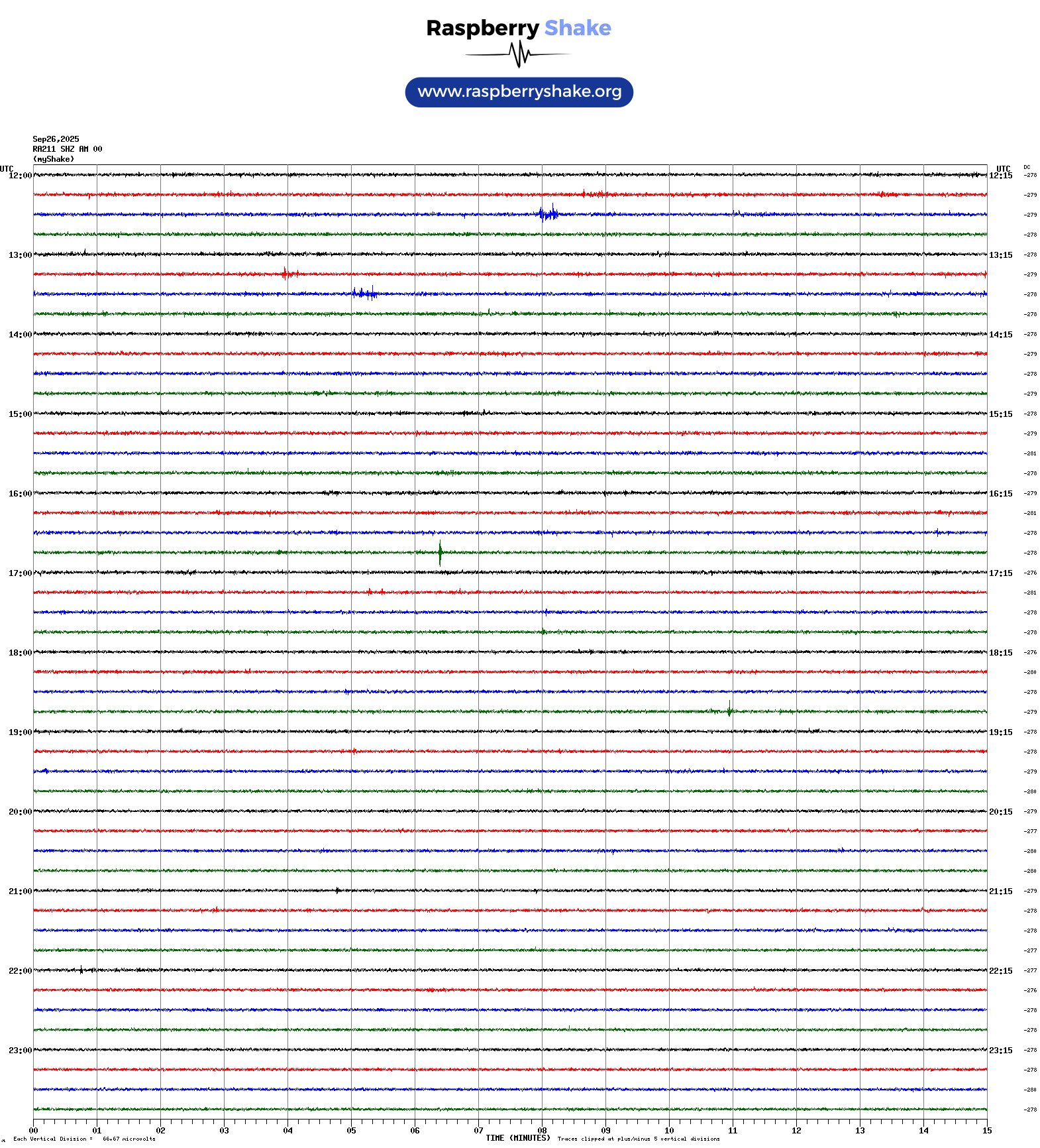 Rechts wird das Seismogramm meines Seismographen Raspberry Shake (RA211) in Naila angezeigt.