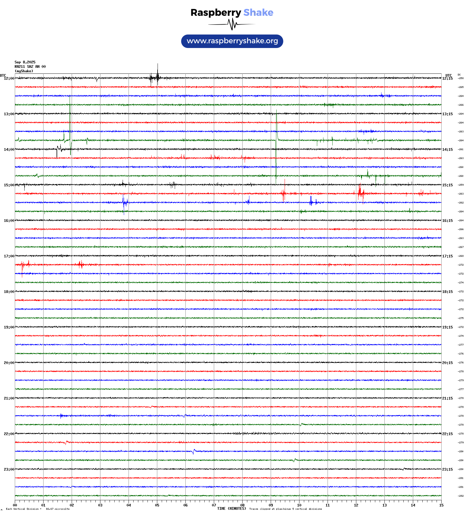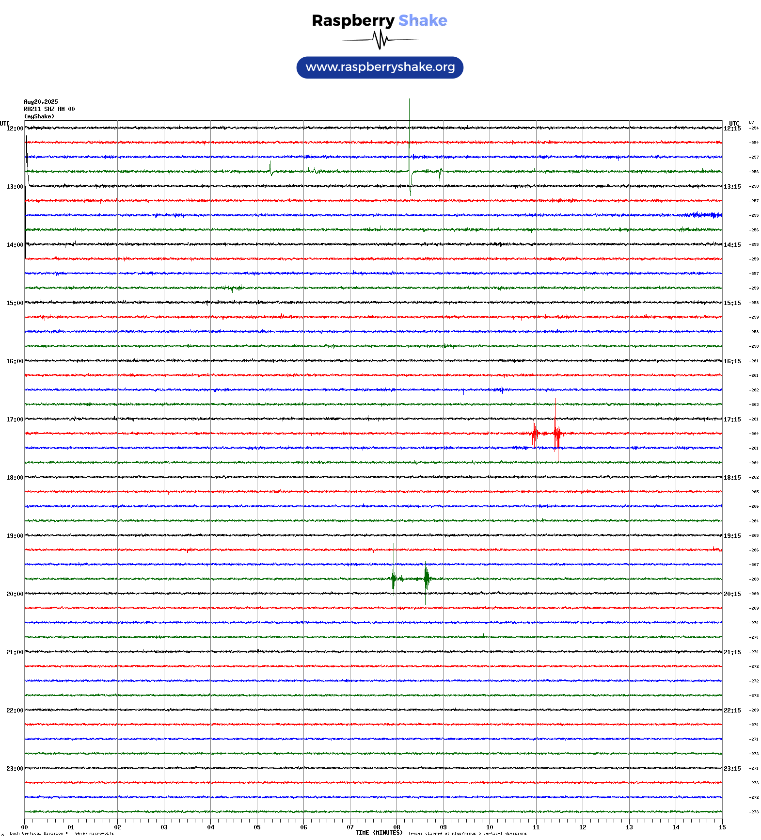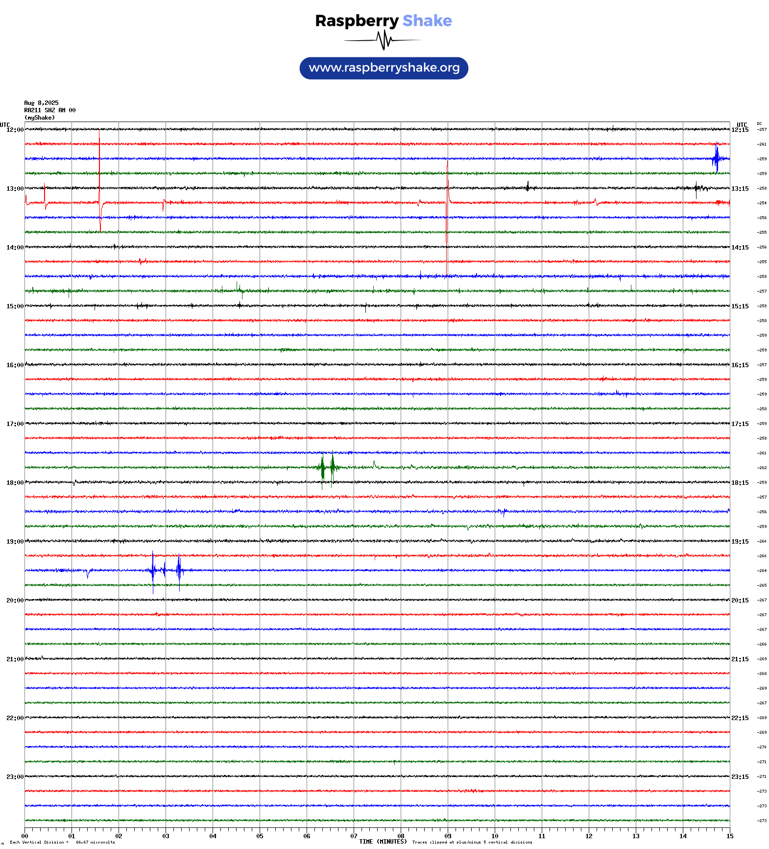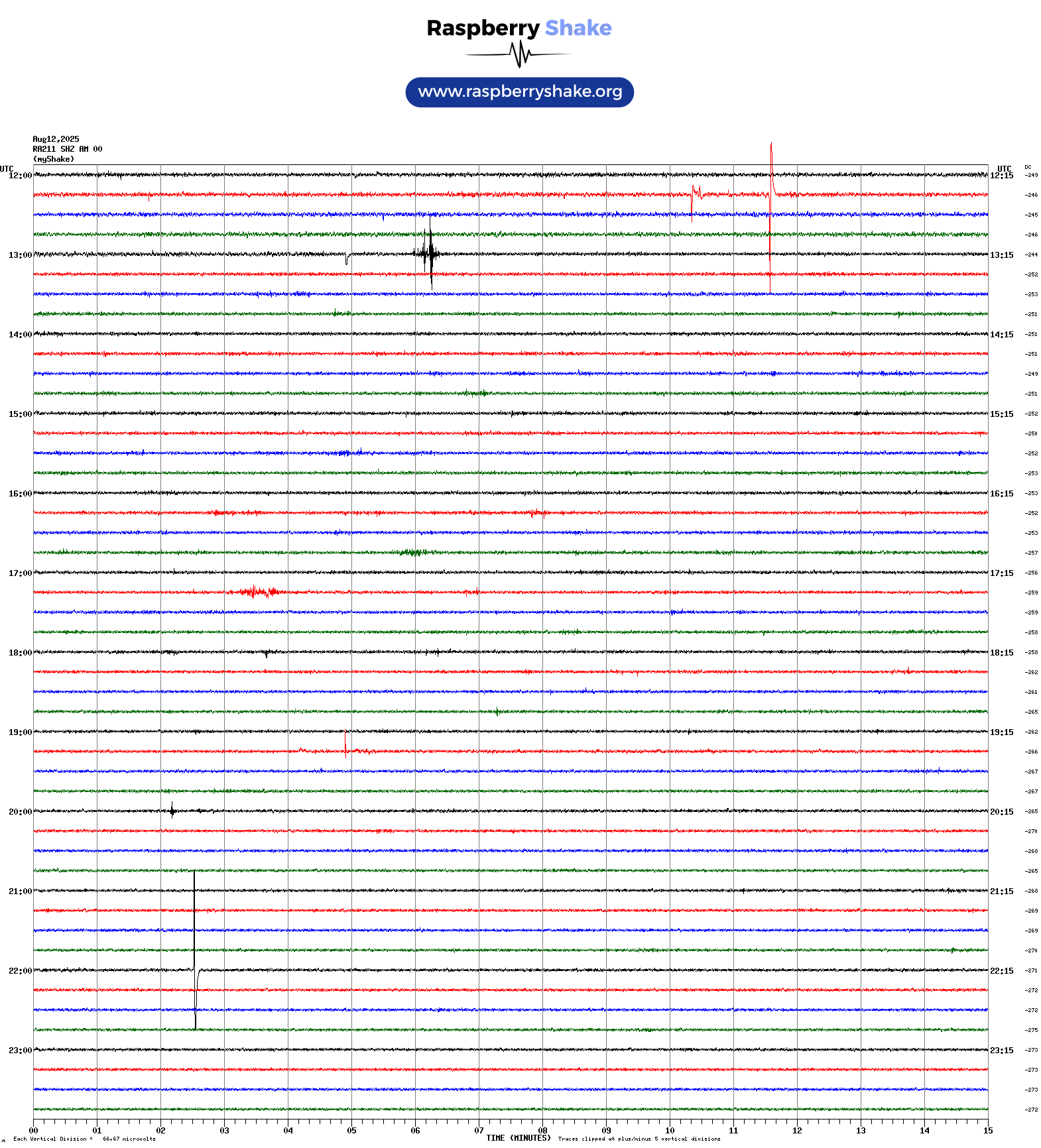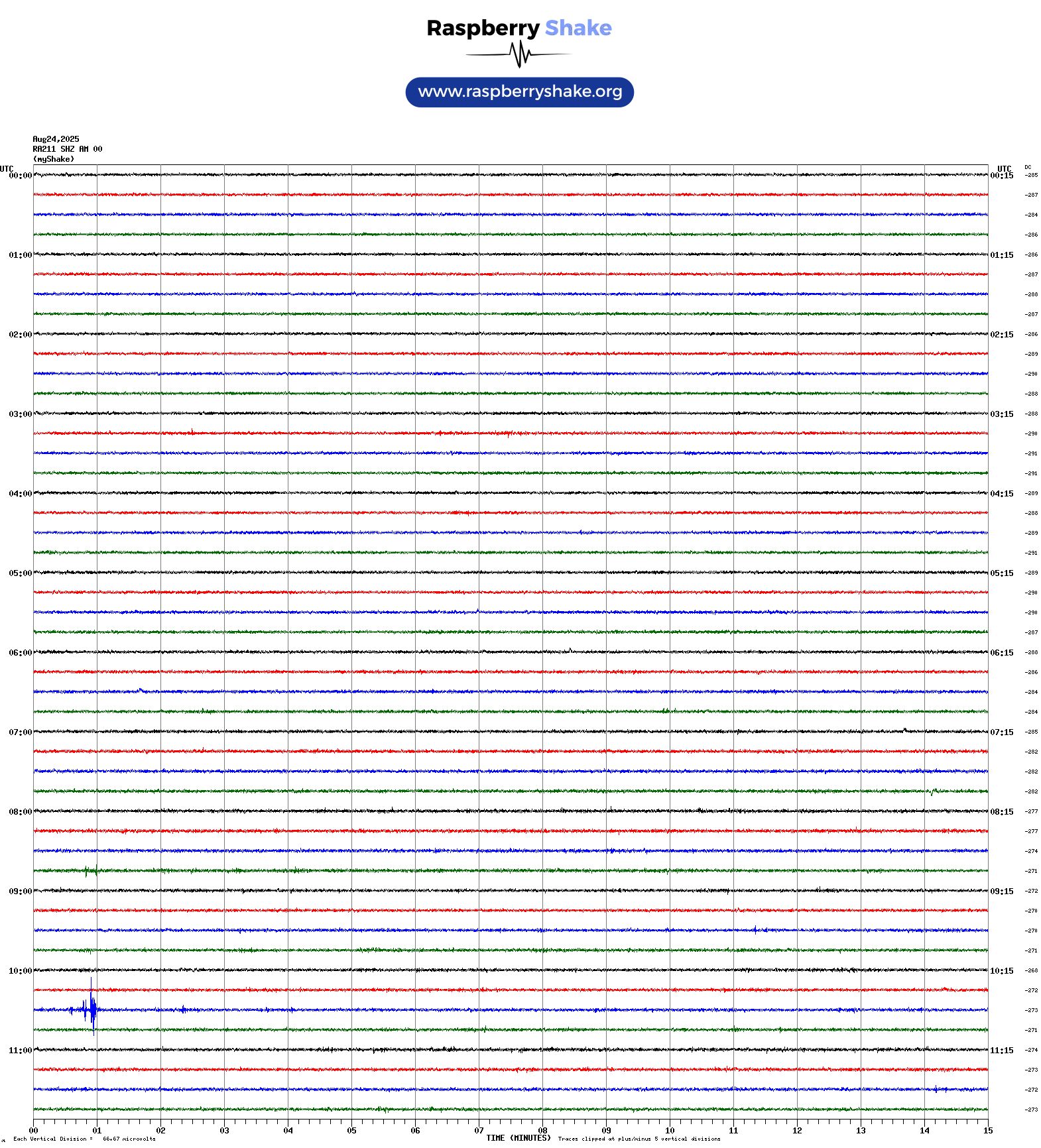 Rechts wird das Seismogramm meines Seismographen Raspberry Shake (RA211) in Naila angezeigt.