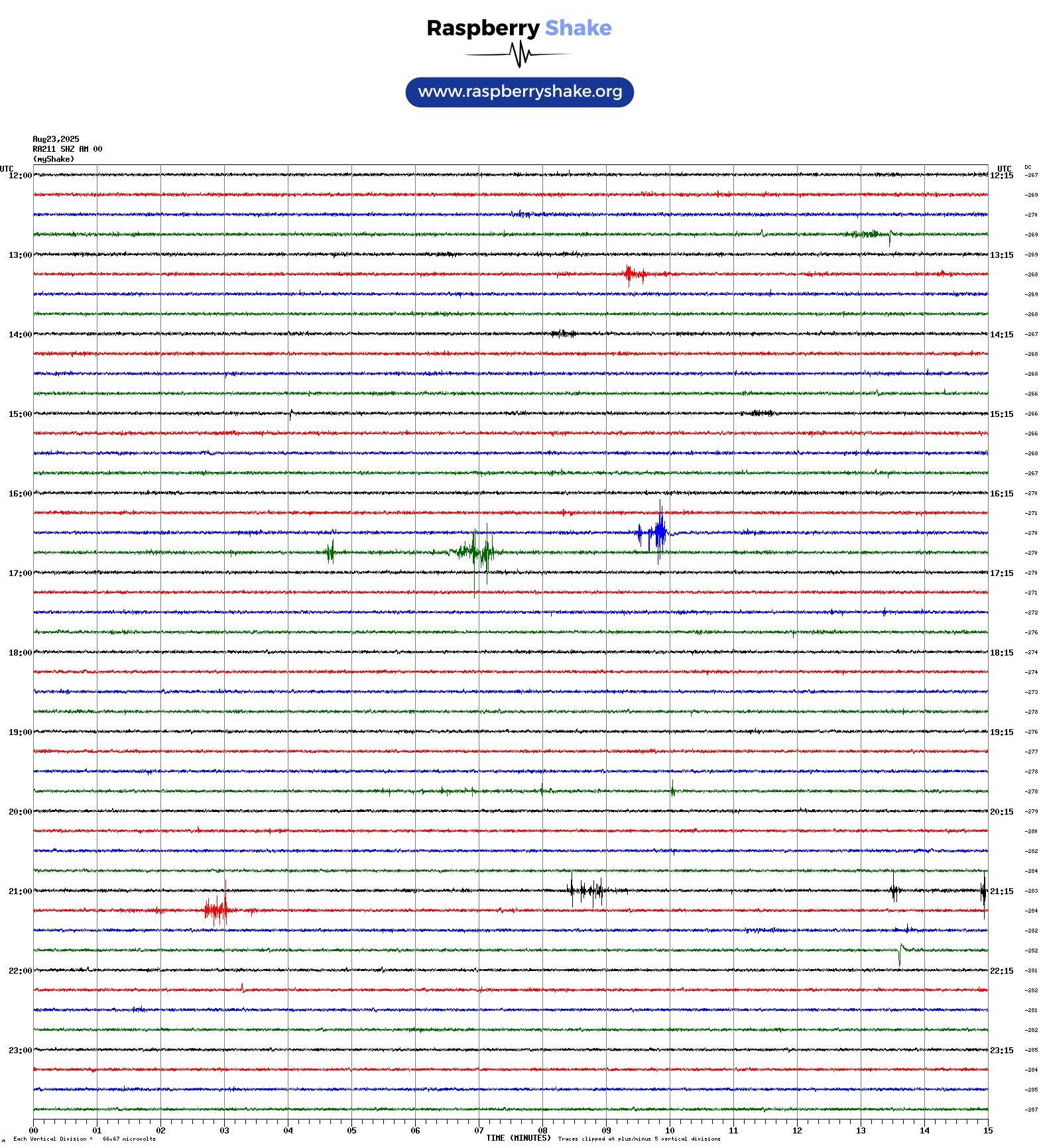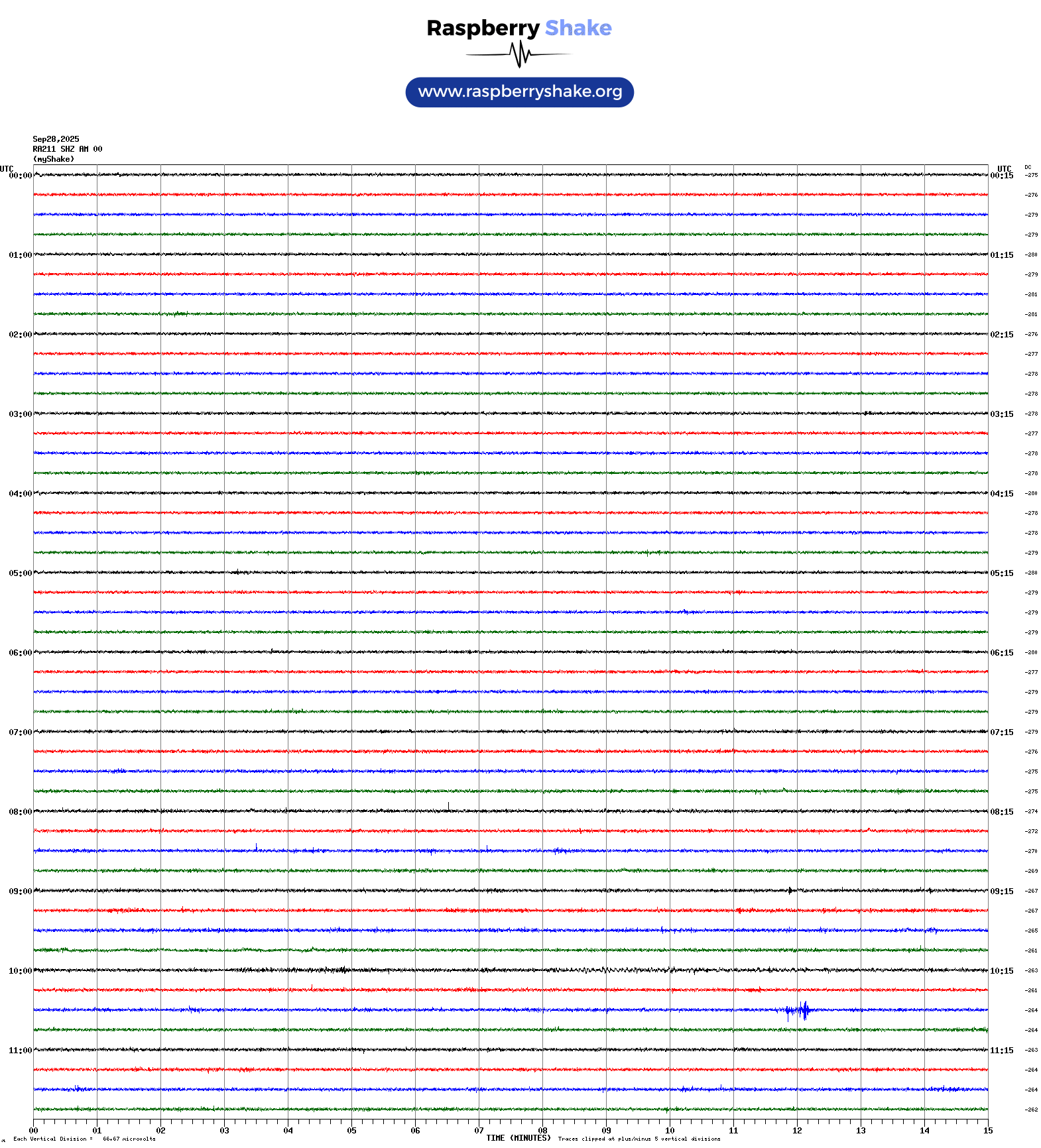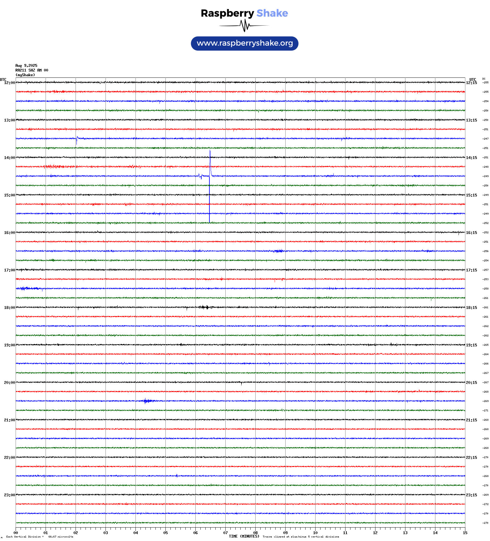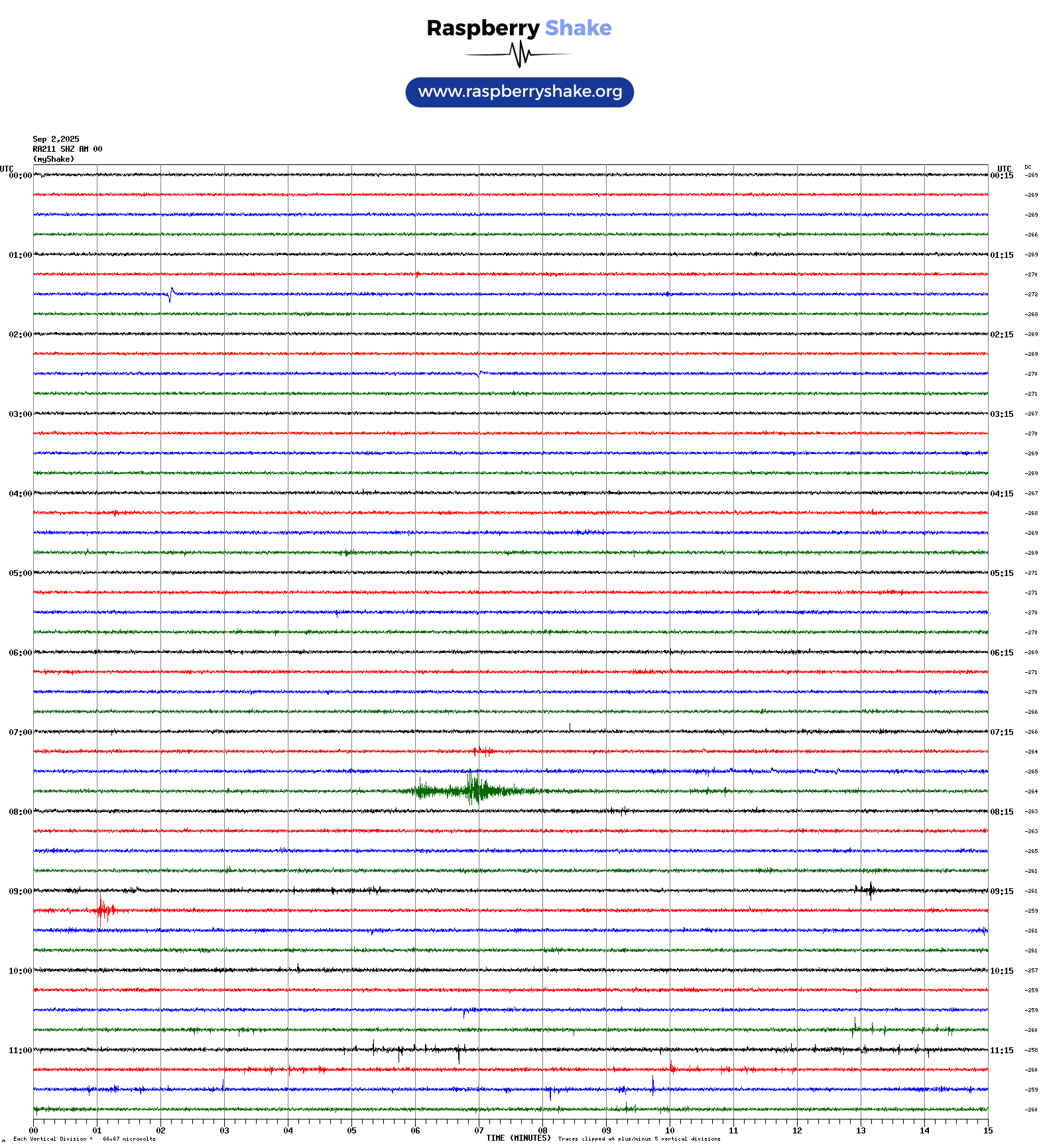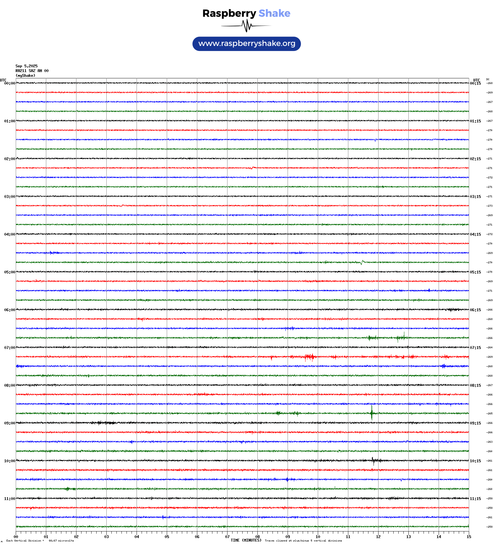 Rechts wird das Seismogramm meines Seismographen Raspberry Shake (RA211) in Naila angezeigt.